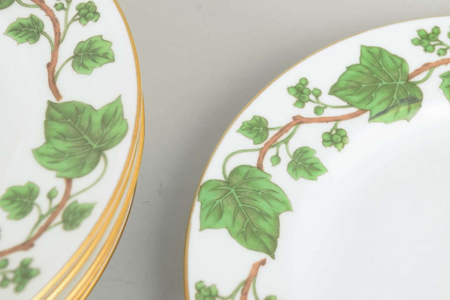 Dekorative fajancetallerkener med grøn vedbend dekoration og guldkant, produceret i Staffordshire, England.