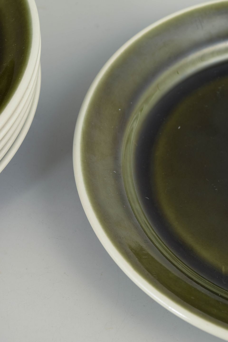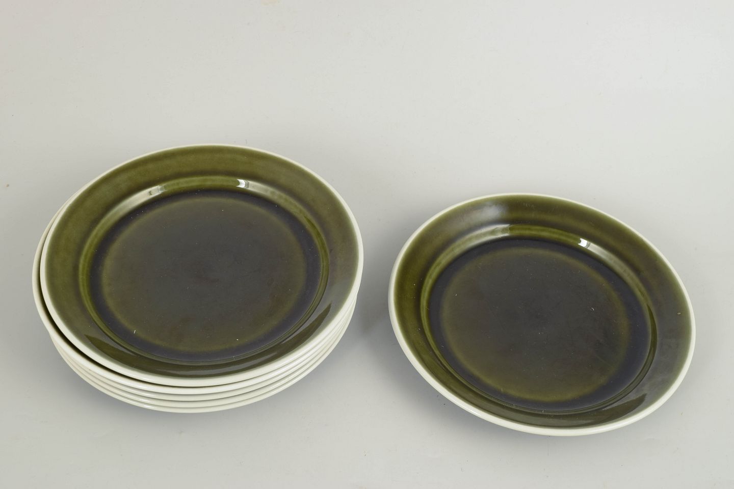 Set of six stoneware plates from the Vardag series with a characteristic green glaze. Simple, functional forms designed for everyday use, reflecting a clear Scandinavian modernist aesthetic.