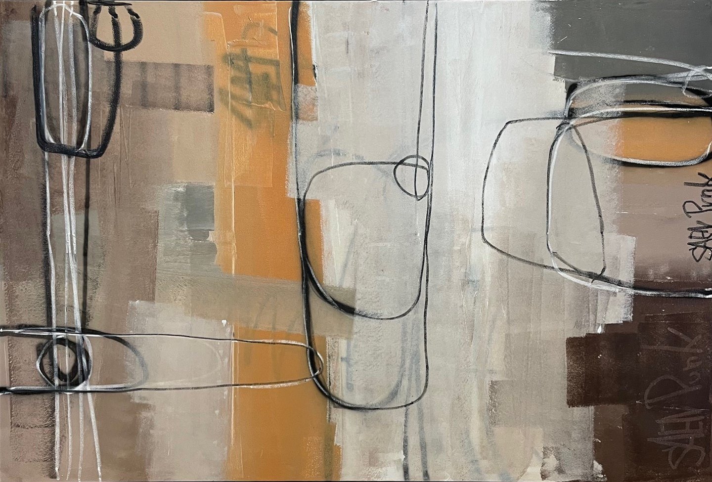 "Komposition" Oliemaleri på lærred, monteret i sølv svæveramme.