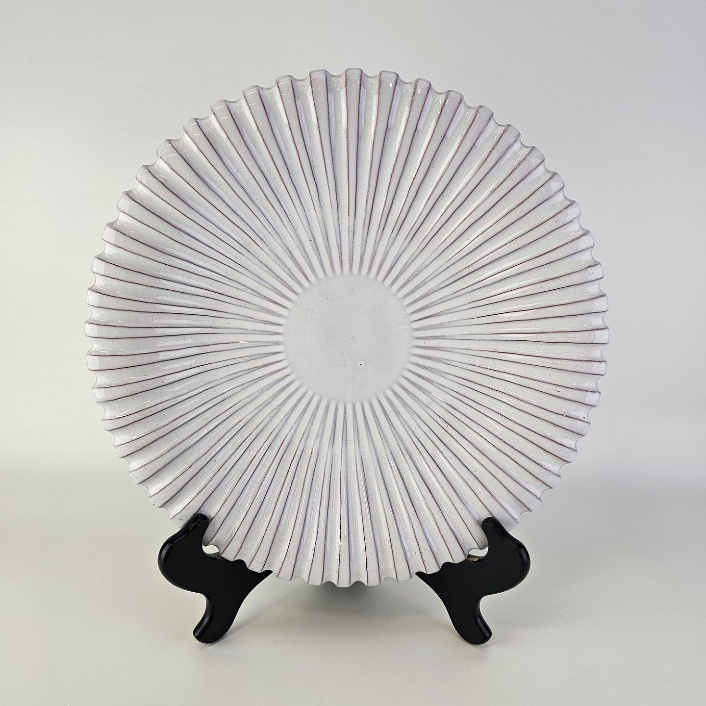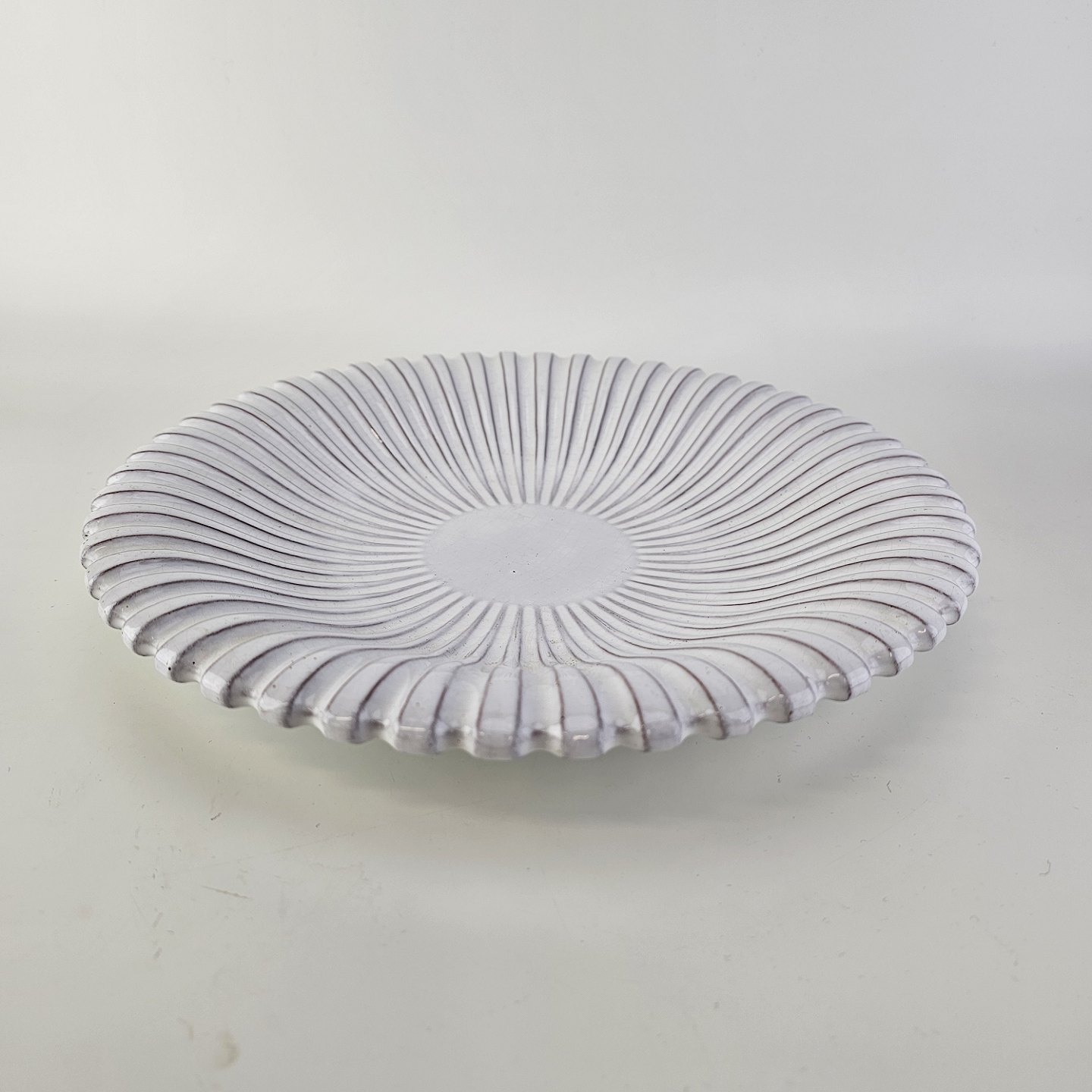Rundt fad med riflet tekstur i keramik med hvid glasur