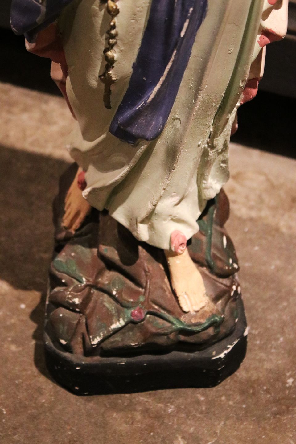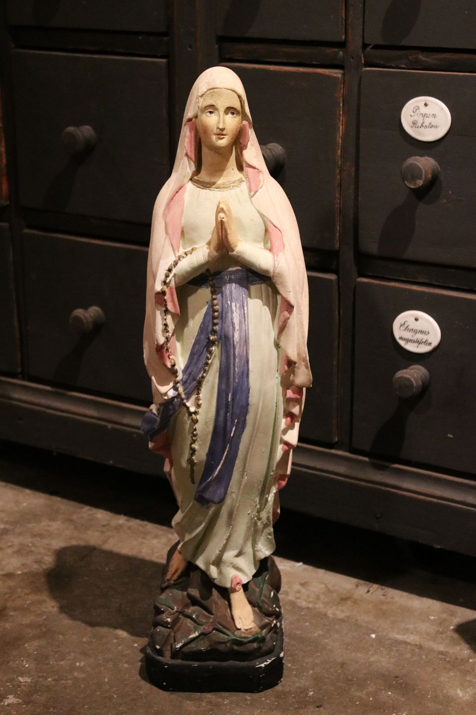 Stor , gammel fransk Madonna figur i gips med fin gammel bemaling og fin patina...