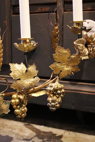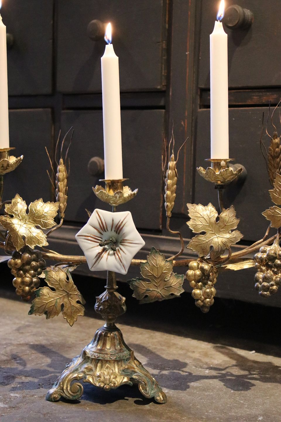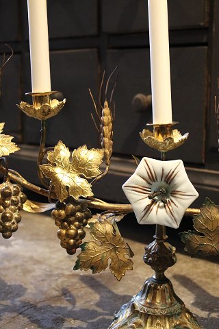 Lysestagen er dekoreret med 1 stor fin hvid porcelæns blomst , drueklaser , vinblade , kornneg og lilje blomster i bronze.