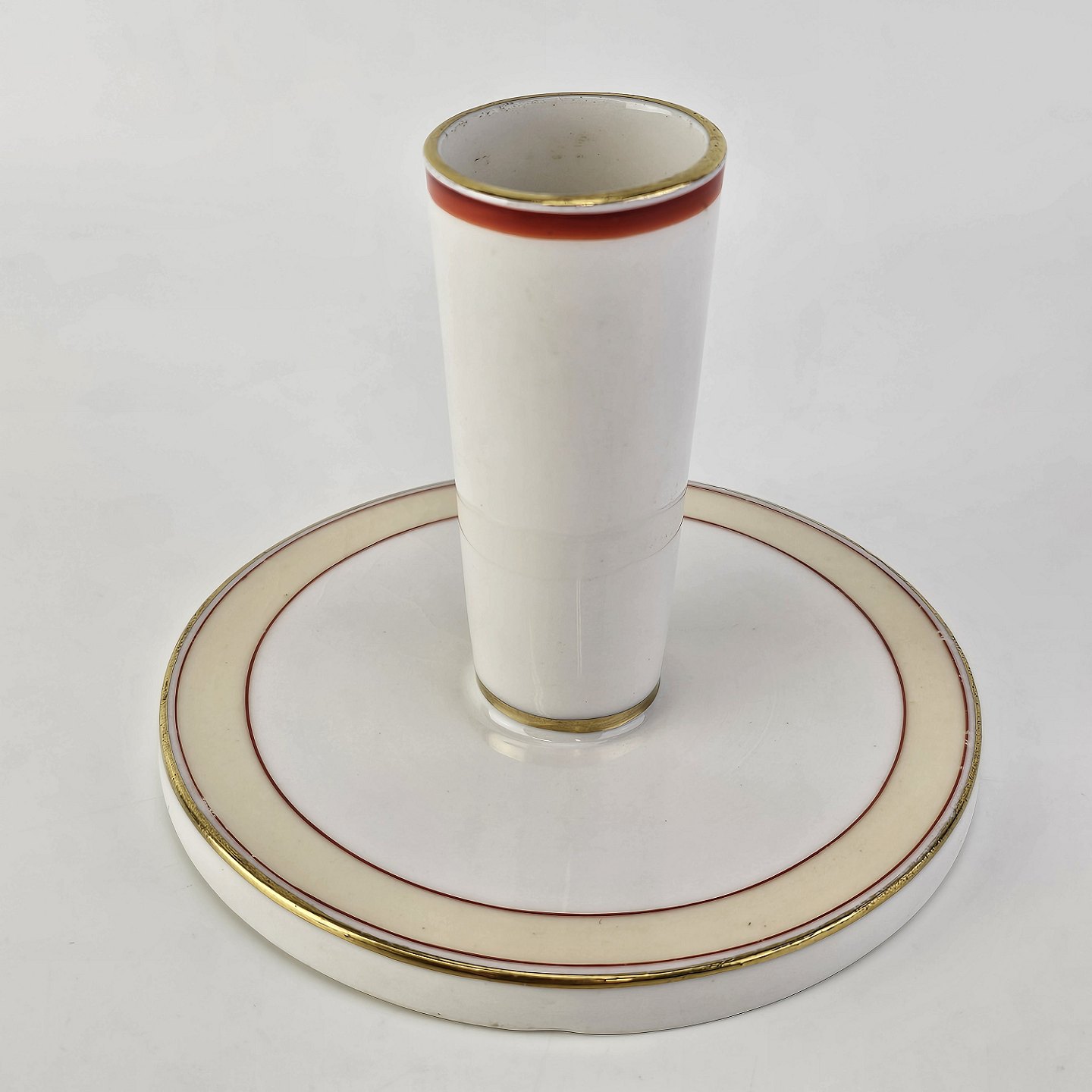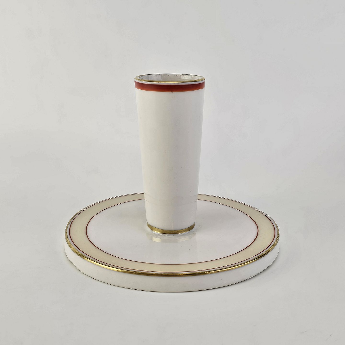 Service i glat hvidt porcelæn pyntet med dekoration i beige, brændt orange og gylden streg.