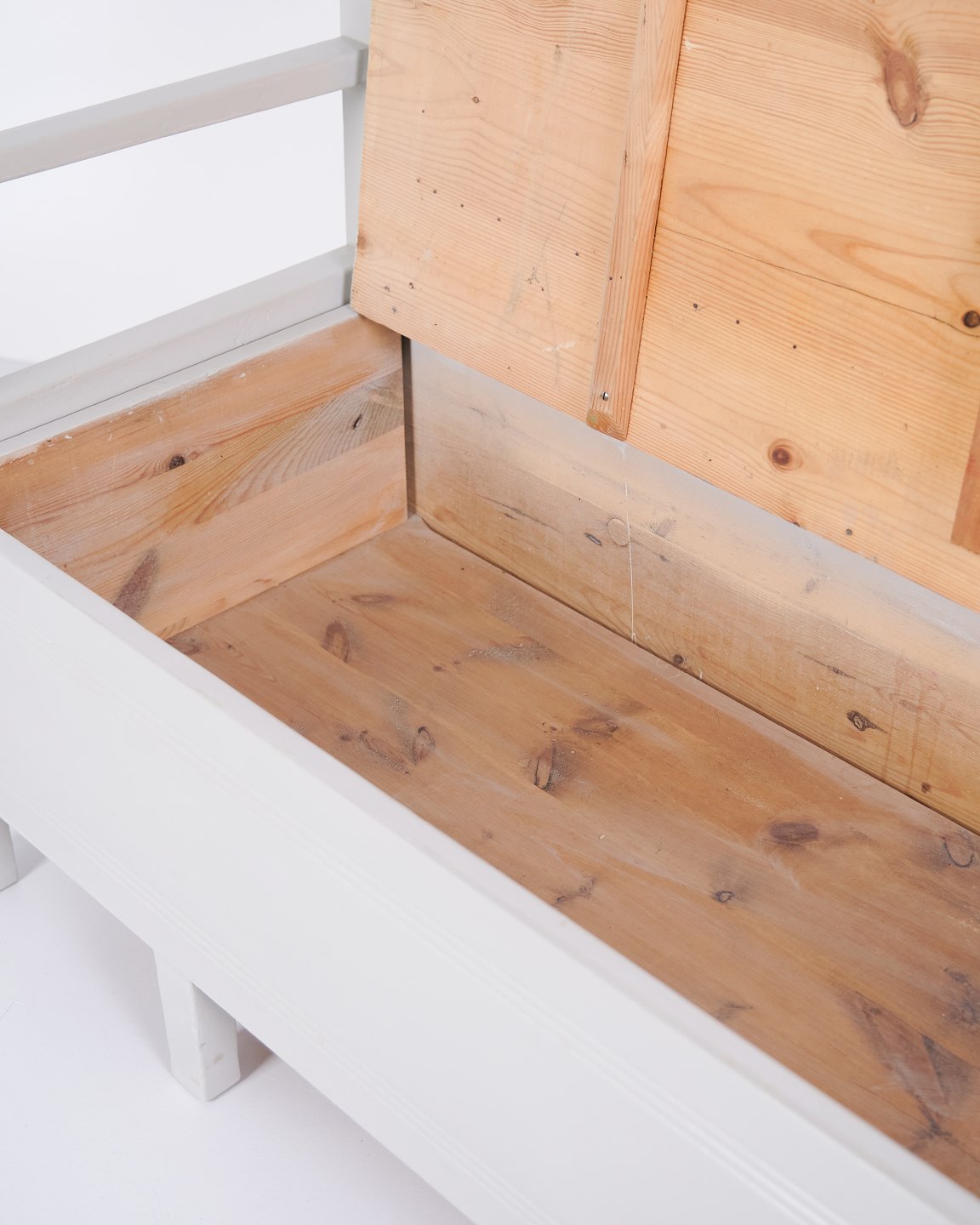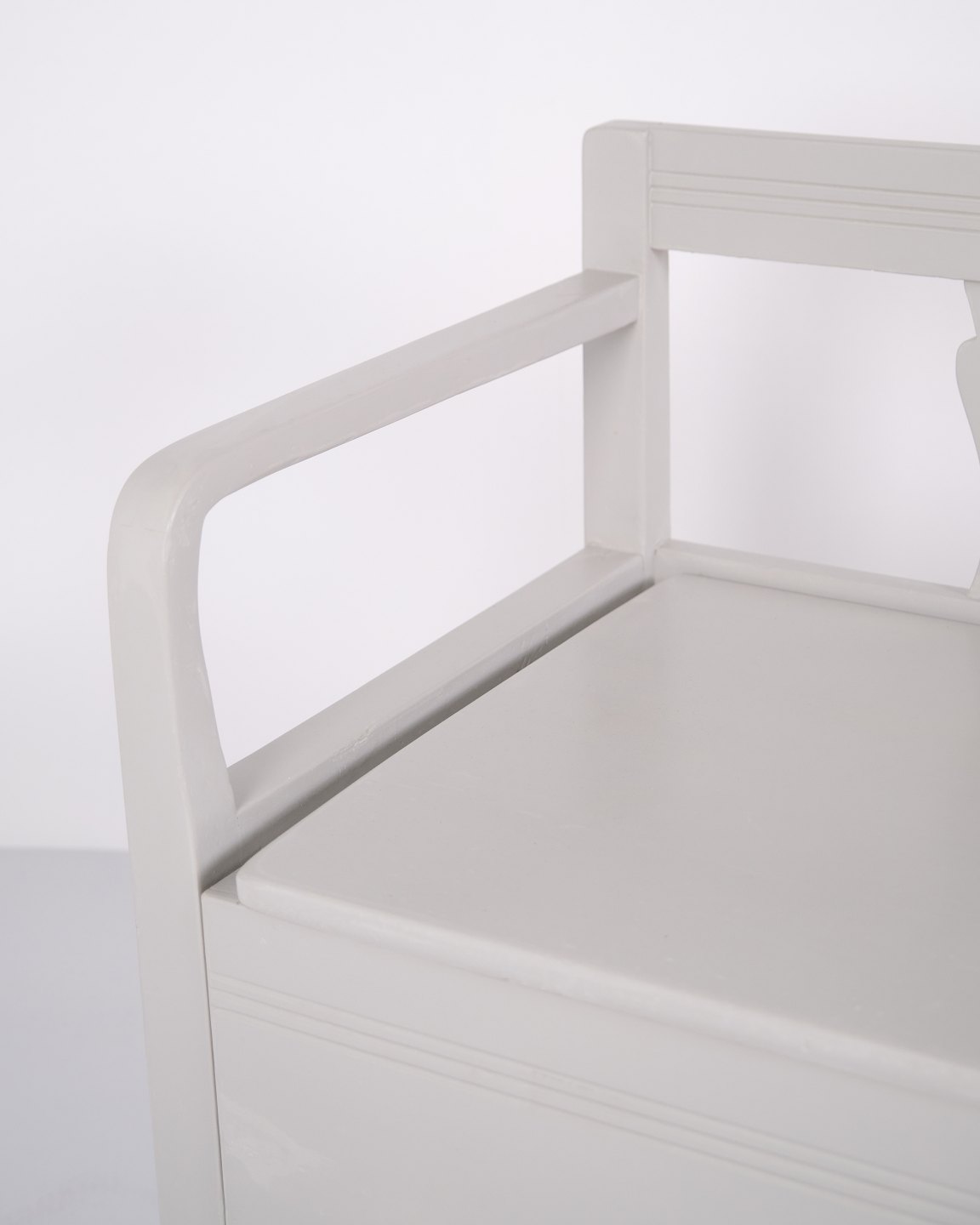 Antik slagbænk fra 1860’erne i gråmalet fyrretræ. Klassisk almuedesign med siddeplads og opbevaring. Historisk og funktionelt møbel.