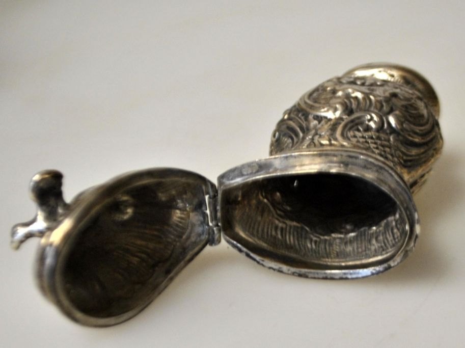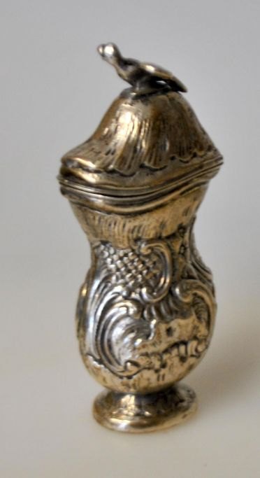 Dansk sølvsmed (18. årh) Rococo hovedvandæg med due. Med talrige rocaille dekorationer. Ustemplet. H.: 8,5 cm.
