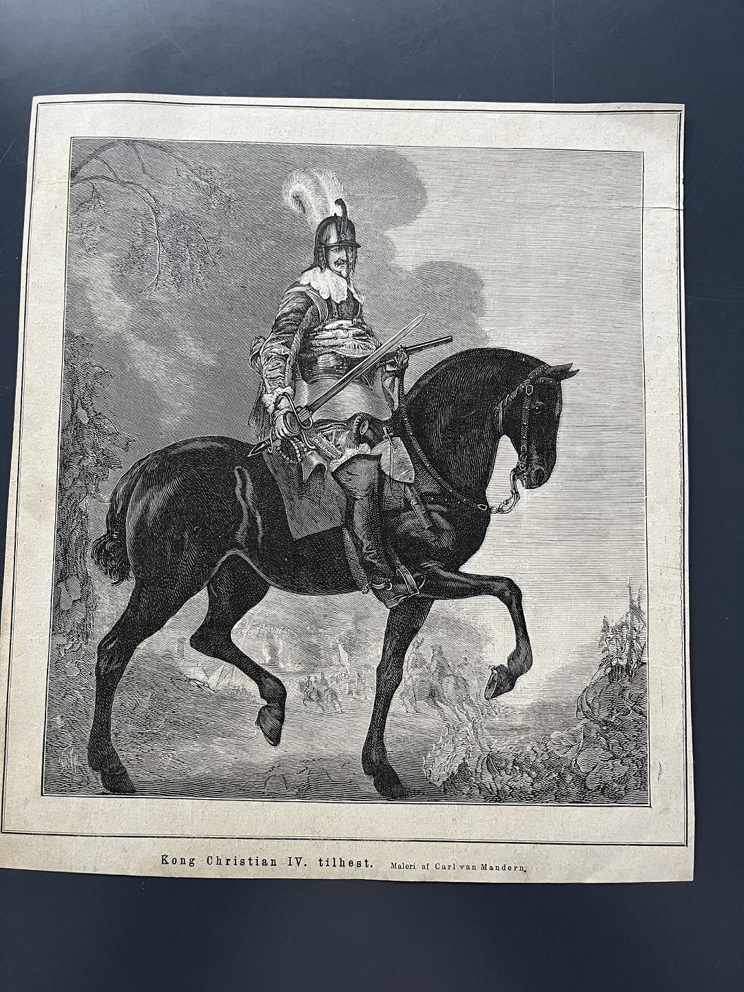 Xylografi af Frederik Hendriksen - HM Kong Christian IV til hest efter maleri af Karel van Mander.