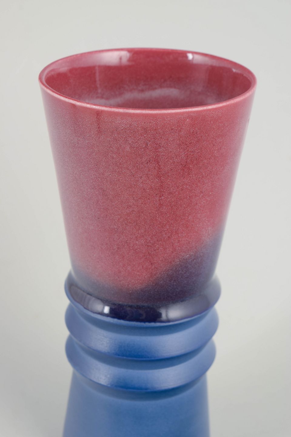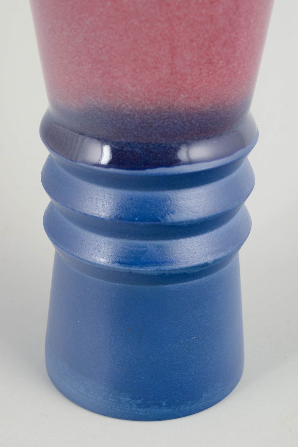 Skulpturelt formet vase i drejet stentøj med markant silhuet. Udført med blank glasur i dybe blå nuancer nederst og rødviolet overgang øverst, typisk for eksperimenterende skandinavisk studiokeramik fra 1960’erne. Det trinvise midterparti giver et arkitektonisk og modernistisk udtryk.