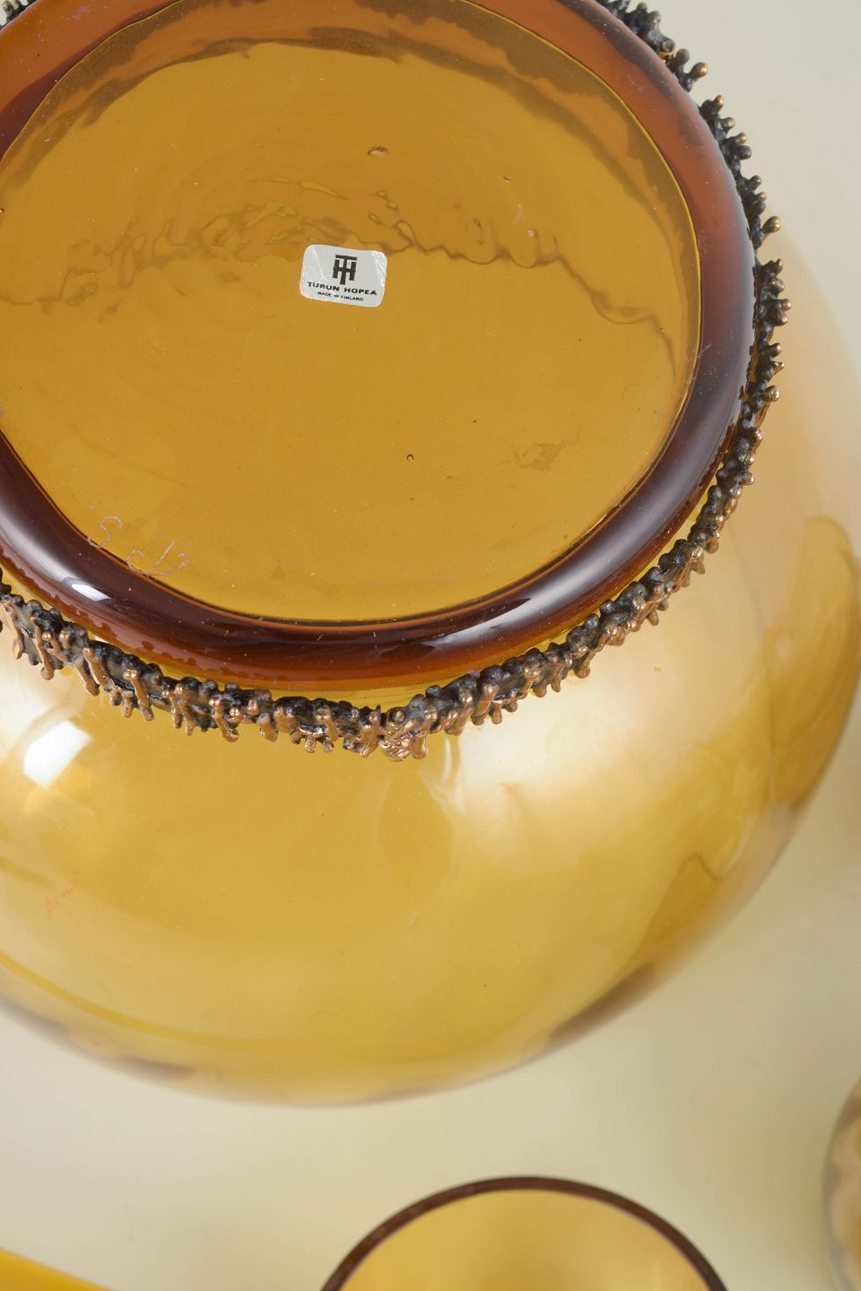 Punchbowlesæt i ravfarvet mundblæst kunstglas med karakteristisk metalfod, bestående af stor punchbowle, 6 glas og tilhørende ske. Det skulpturelle design er kendetegnet ved kontrasten mellem det varme glas og den rå, teksturerede metalfod.