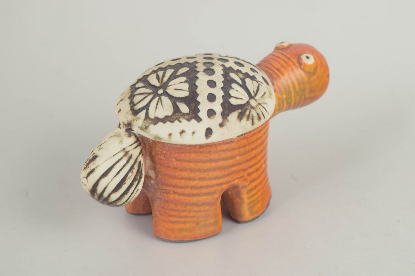 Stylised stoneware turtle with a compact, almost architectural body and short, sturdy legs. Finished with a warm orange-brown glaze to the body and a contrasting shell decorated with graphic floral and dot motifs in black and off-white. A characteristic example of Lisa Larson’s figurative design from the 1970s, combining humour, simplicity, and strong decorative presence.