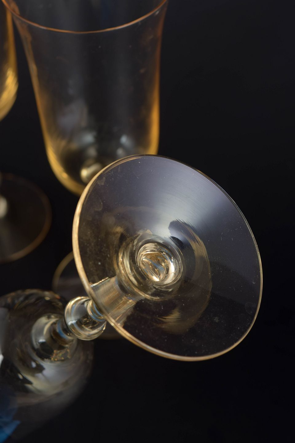 Sæt med tre champagneglas i klart glas med let gylden tone, slank kumme og balusterformet stilk på rund fod. Elegant og tidstypisk skandinavisk formsprog, hvor den varme farvetone giver et mere dekorativt udtryk. Model : “Salut”.