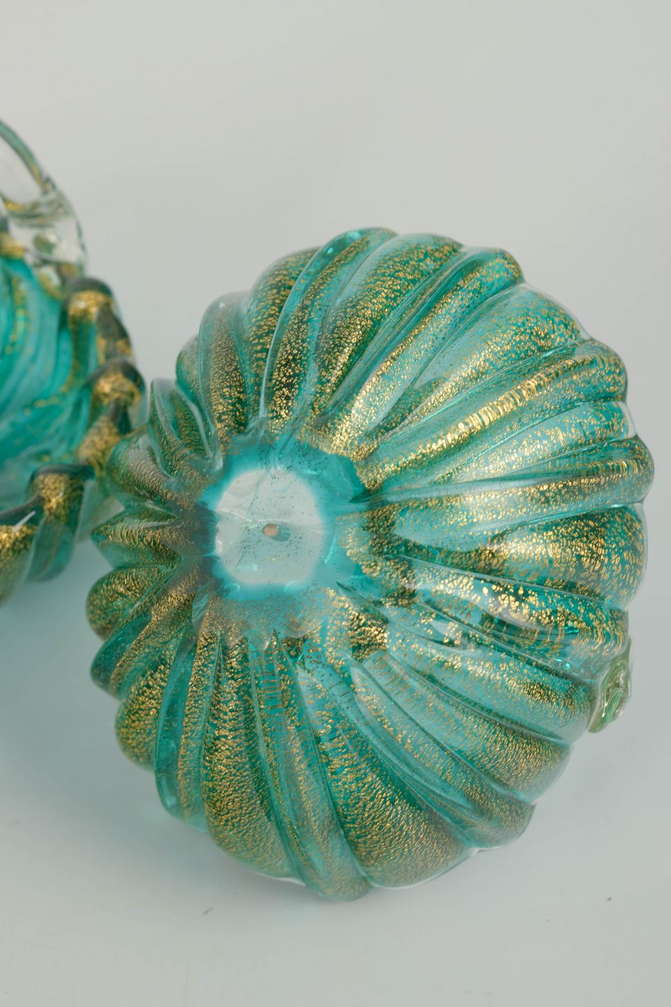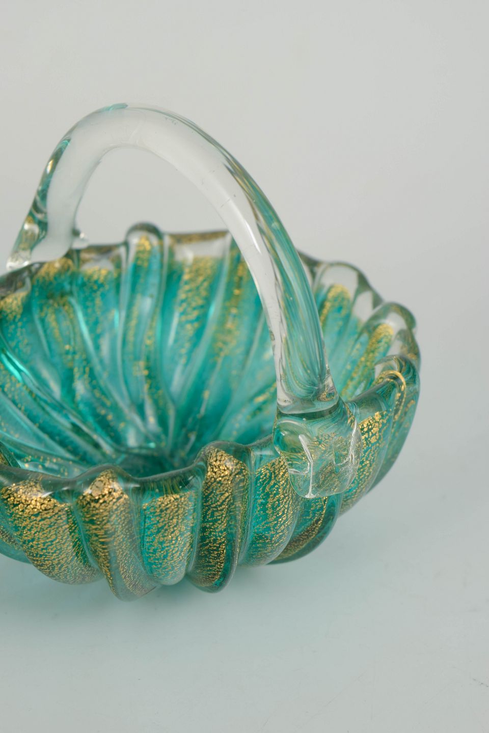 Murano har gennem århundreder været centrum for italiensk glaskunst og er internationalt anerkendt for sit raffinerede håndværk og sine innovative teknikker. I midten af det 20. århundrede blev organiske former, farvet glas og dekorative effekter som gyldne indeslutninger anvendt til at skabe kunstneriske hverdagsobjekter, der forener funktion og æstetik.