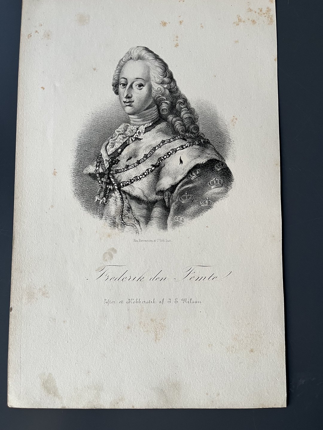 Litografi af Em. Bærentzen - Portræt af HM Kong Frederik V af Danmark og Norge.
