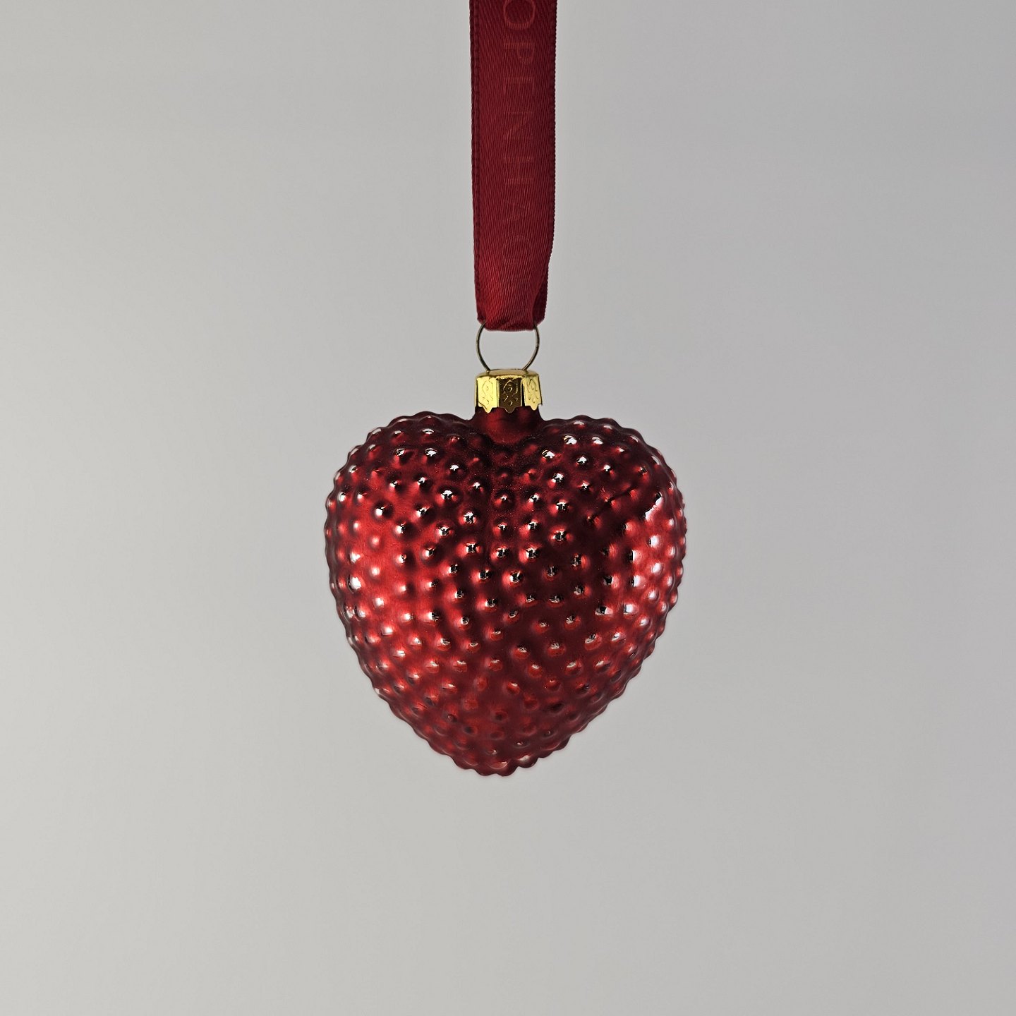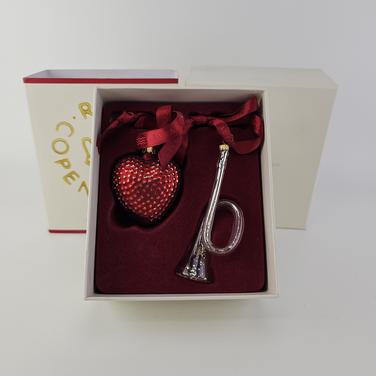 Juleornamenter i glas med motiv af et hjerte og en trompet med rødt bånd til ophæng