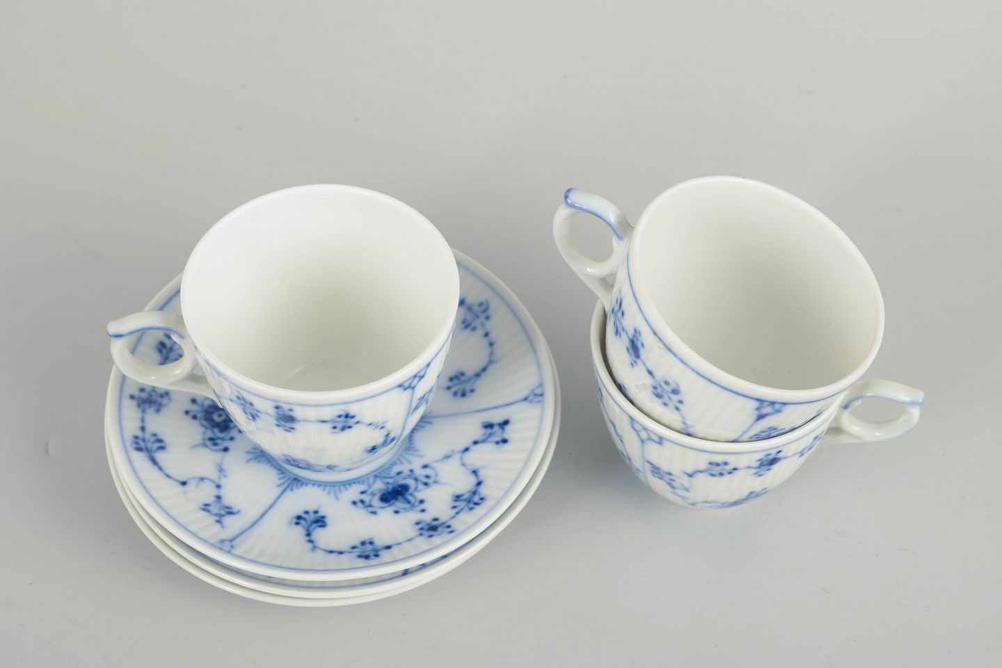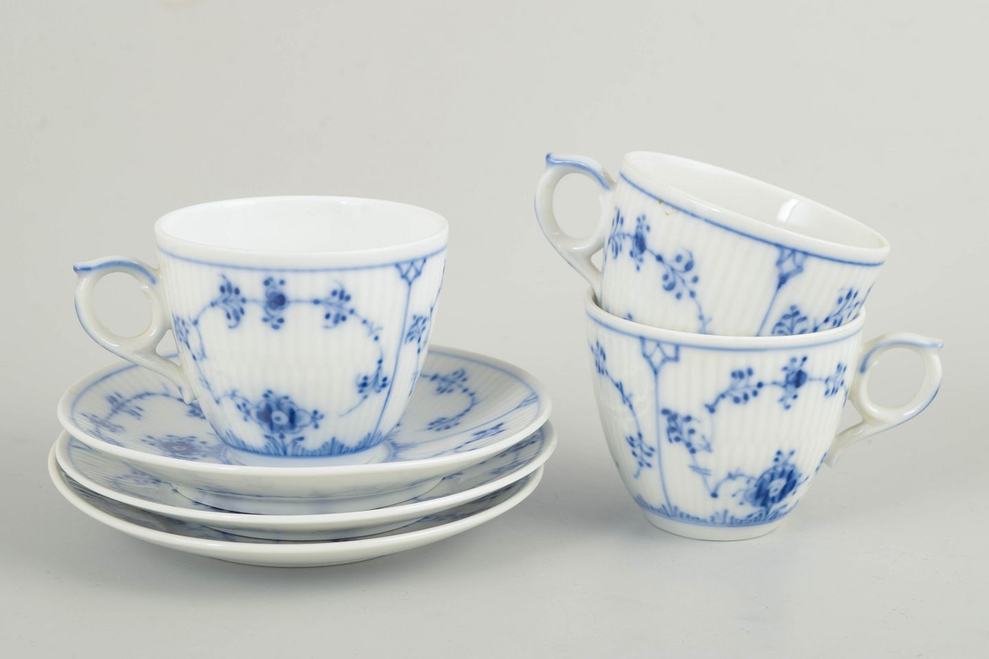 Set of three coffee cups with matching saucers in glazed porcelain, decorated with hand-painted underglaze in the classic Blue Fluted Plain pattern. Model 1/298.