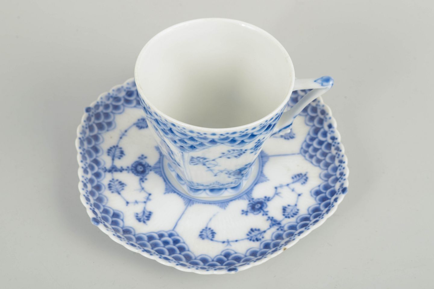 Royal Copenhagen, Blue Fluted Full Lace coffee cup with saucer.