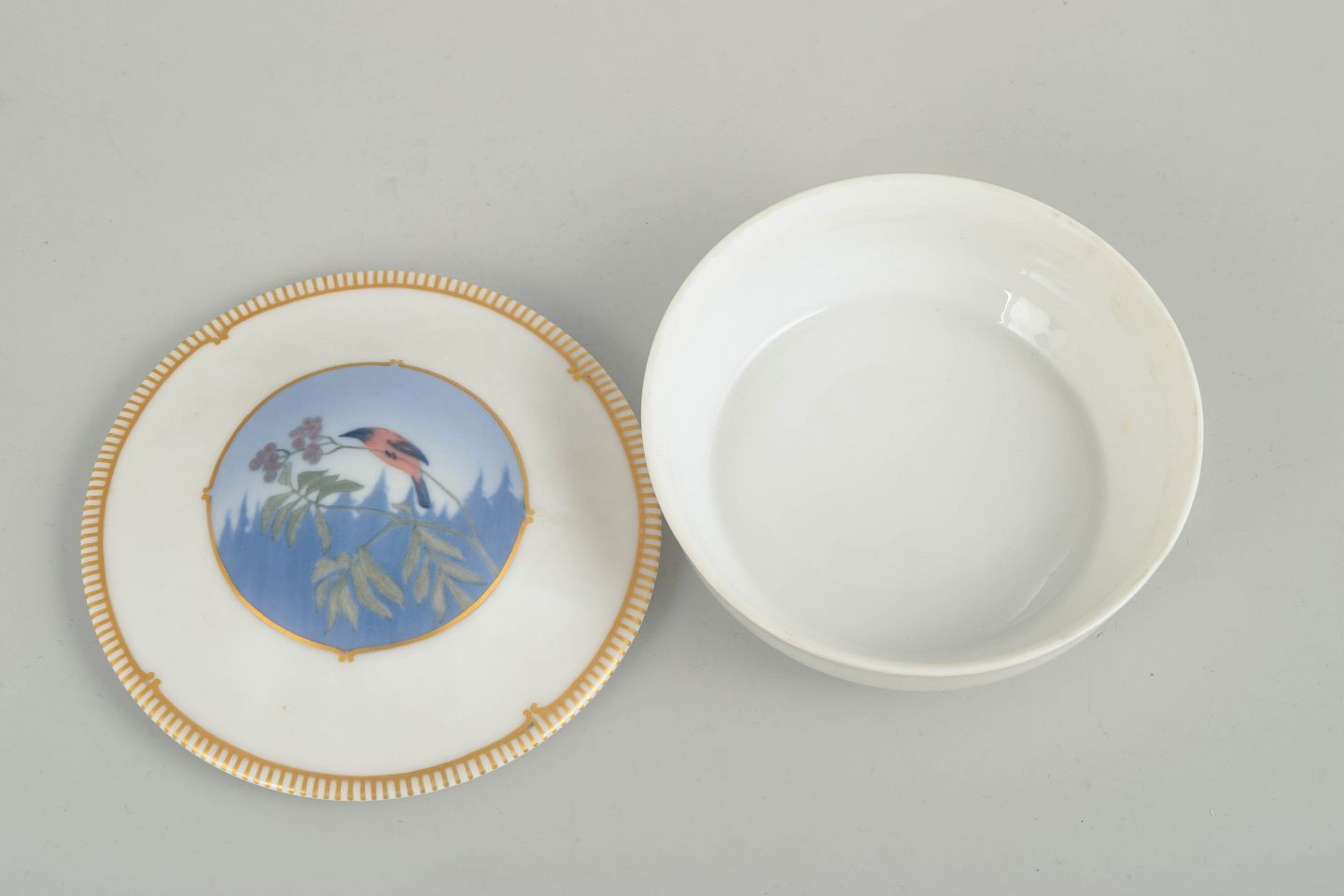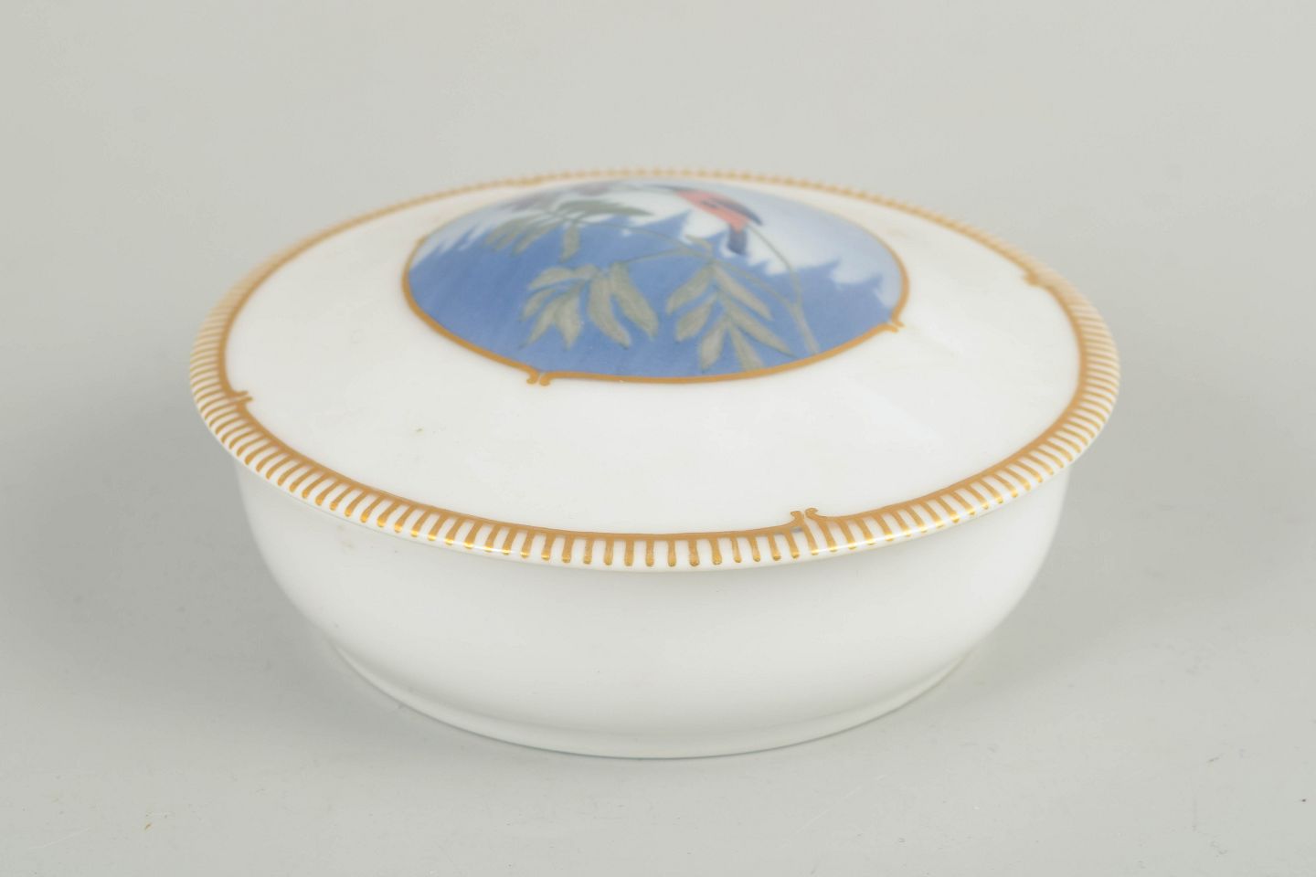 Art Deco lidded dish in white-glazed porcelain with a wide gilt rim and a central hand-painted bird motif in blue and green tones. First quality. Model 1340/2.