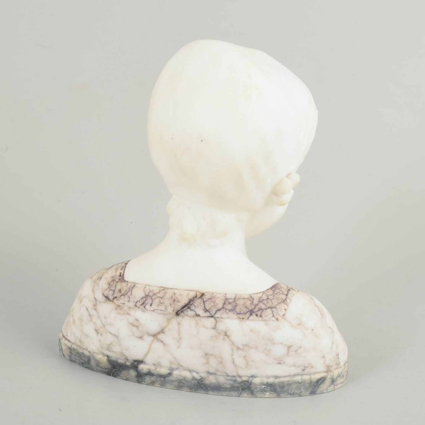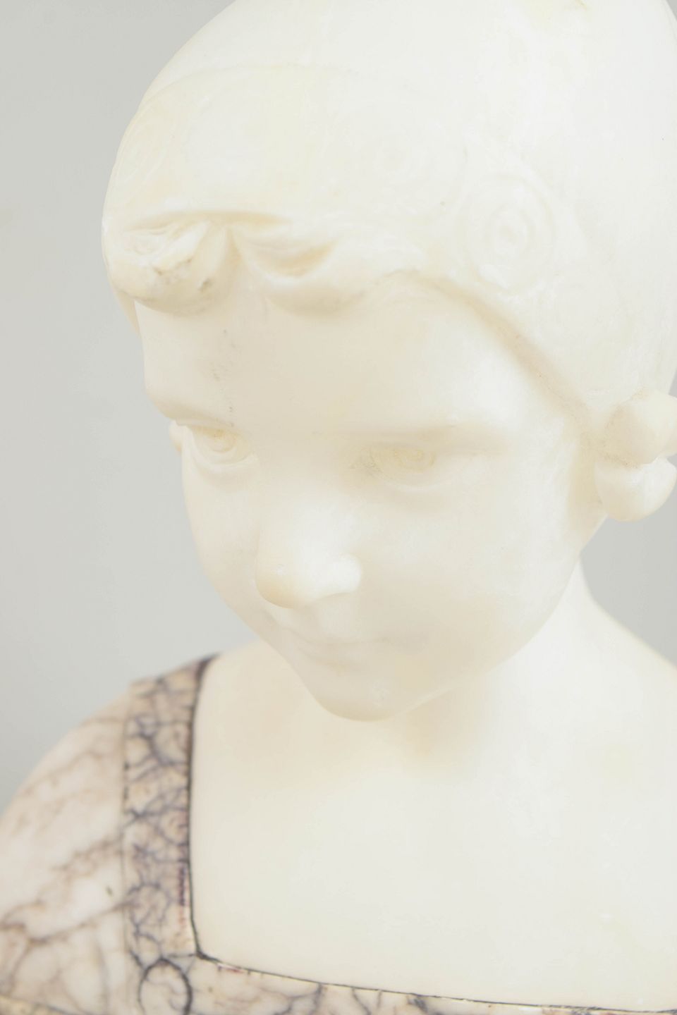 Elegant bust in white marble depicting a softly modelled young girl, set on a low base in veined marble, executed in the Art Nouveau style.
