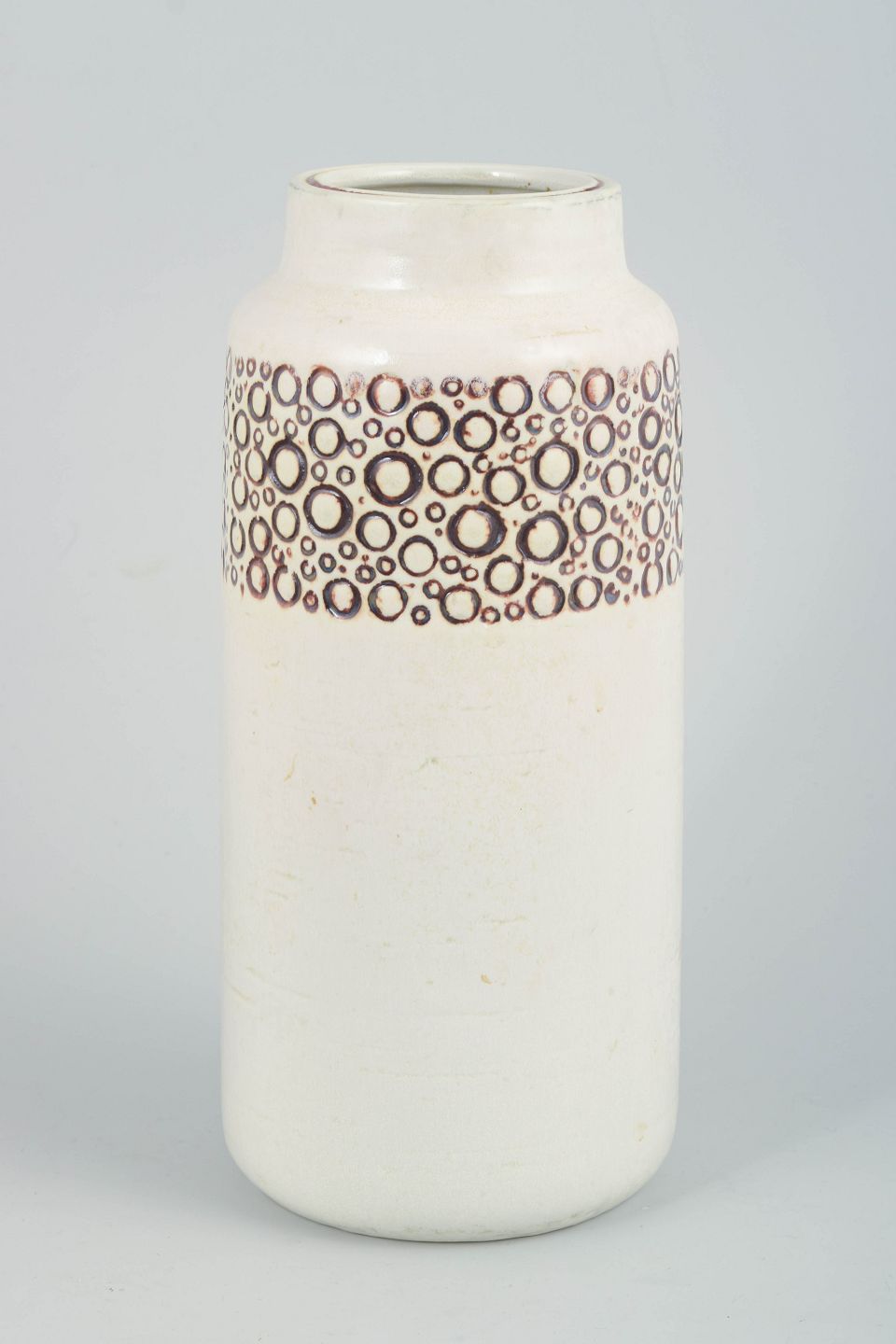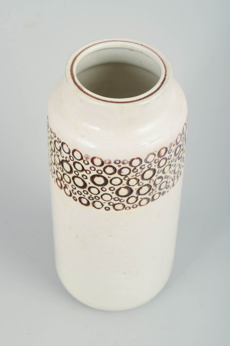 Cylinderformet vase i glaseret stentøj med hvid bund og dekorativ bånddekoration af brune cirkulære mønstre omkring skulderen. Enkelt og grafisk formsprog, typisk for Lisa Larsons produktion hos Gustavsberg i 1970’erne. Modellen indgår i Gustavsbergs dekorative stentøjsproduktion fra perioden.