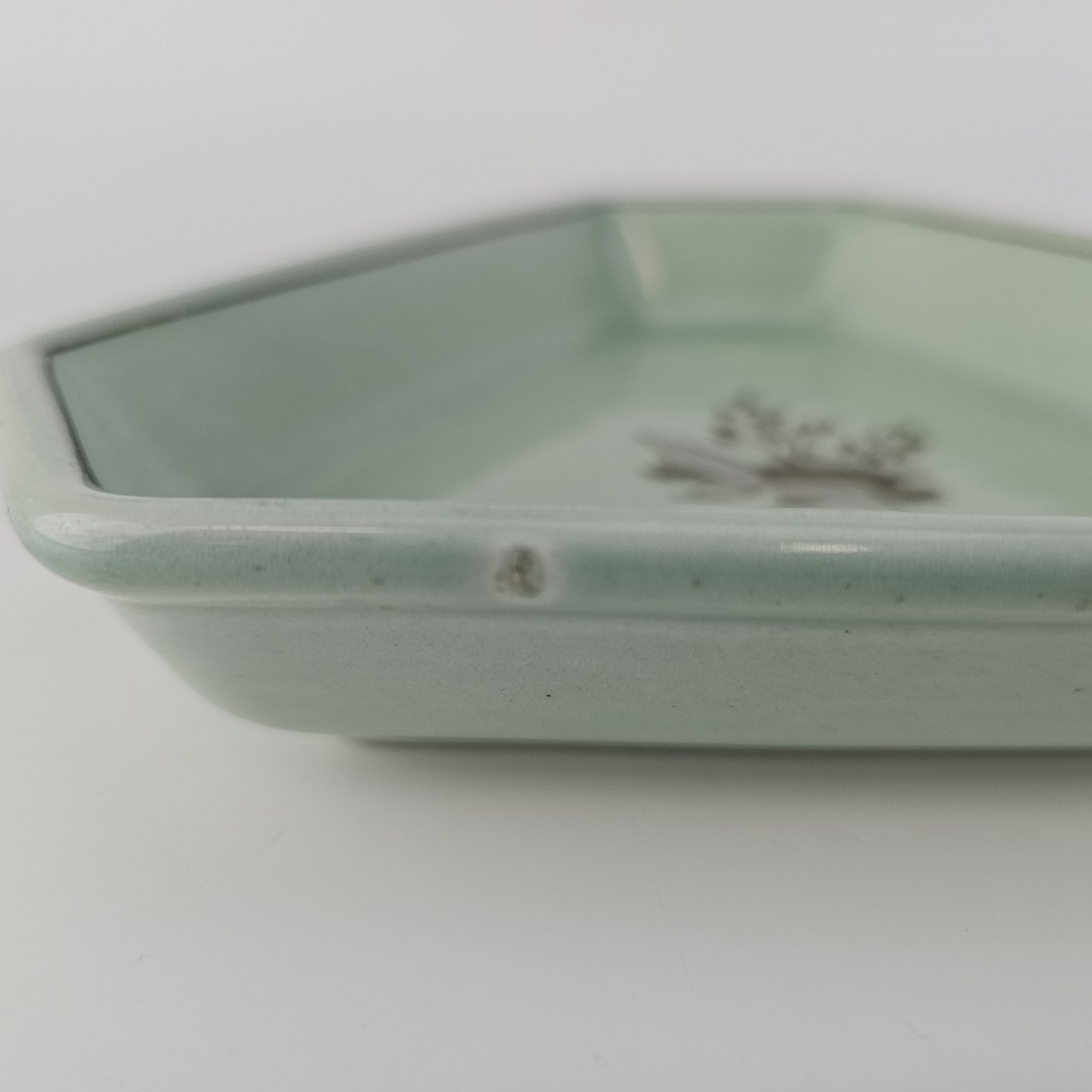 Stel i lysegrøn fajance med natur dekoration og flettet kant