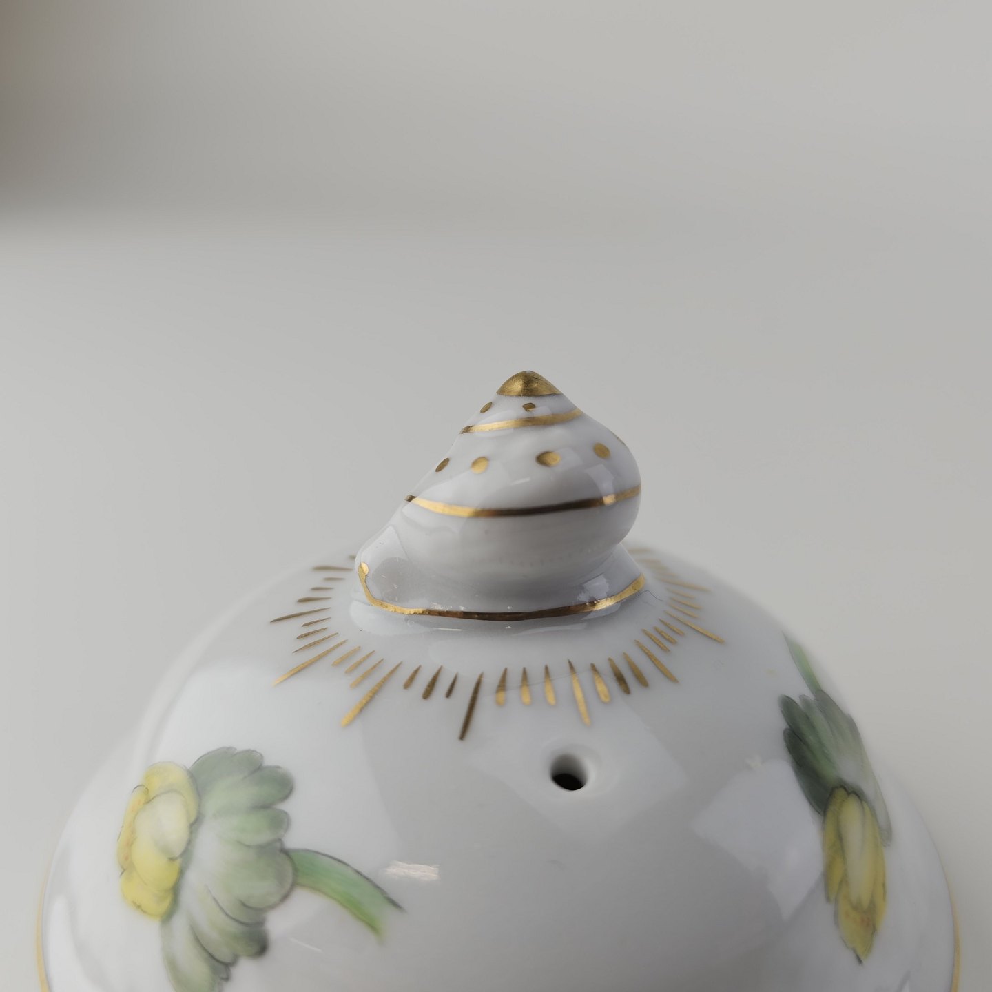 Hvidt porcelæn i skælform med dekoration af gule blomster og guldkant