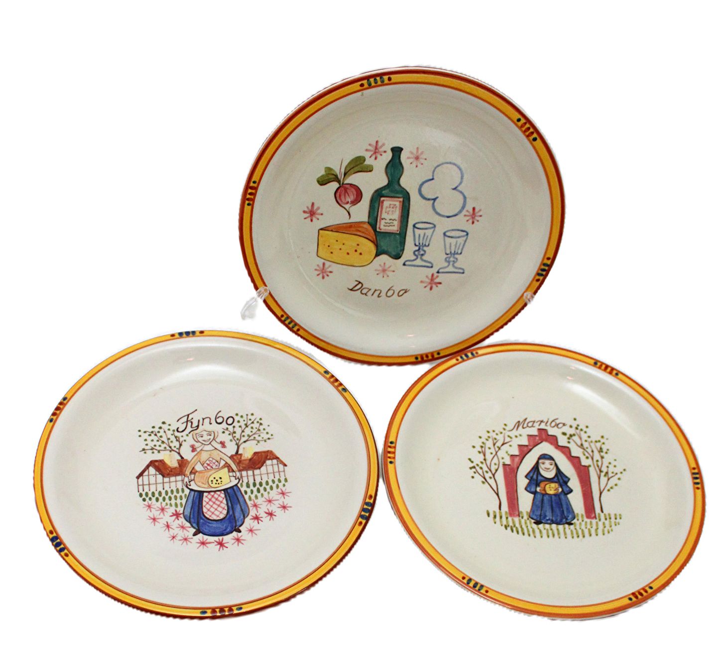 Knabstrup, Ostestellet. Formgivet af Johannes Hansen i 1959 og dekoreret af Paul Høyrup. Motiv og navn for de forskellige danske ostetyper, Fynbo, Molbo, Danbo, Maribo, Esrum og Samsø.