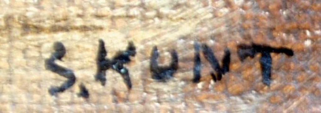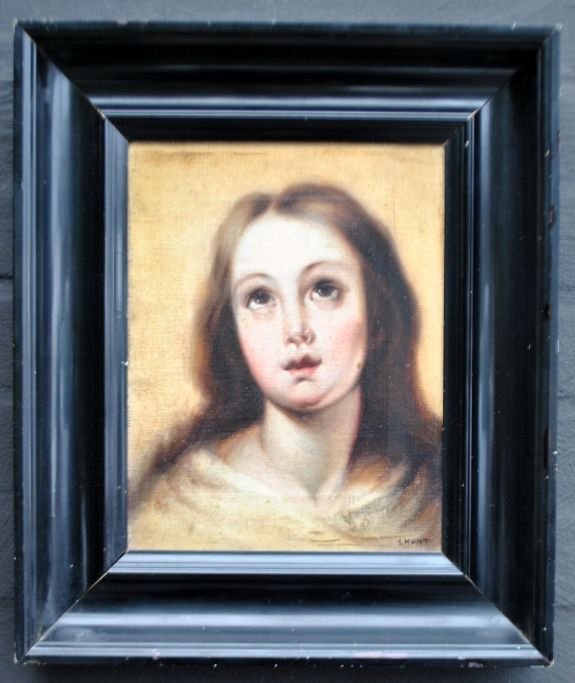 Kunt, S. (19, årh.): En jomfrus ansigt. Olie på lærred. Signeret. 27 x 20,5 cm.