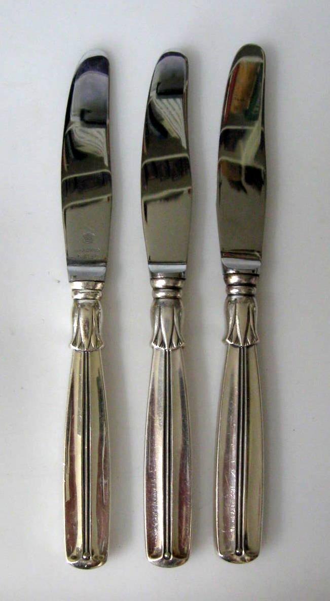 Knive. L.: 22 cm. Med Raadvad knivblad. Stemplet 830 s. Pt. Pt.: 25 stk. på lager. Pris pr. stk: 350,- kr.