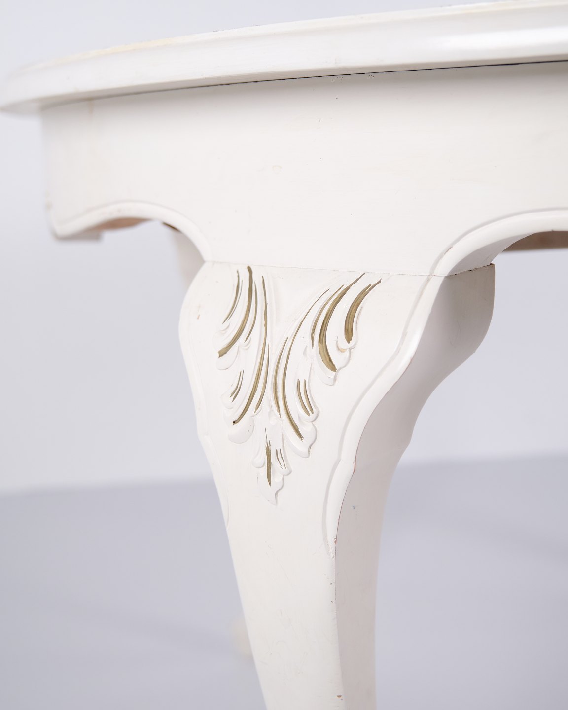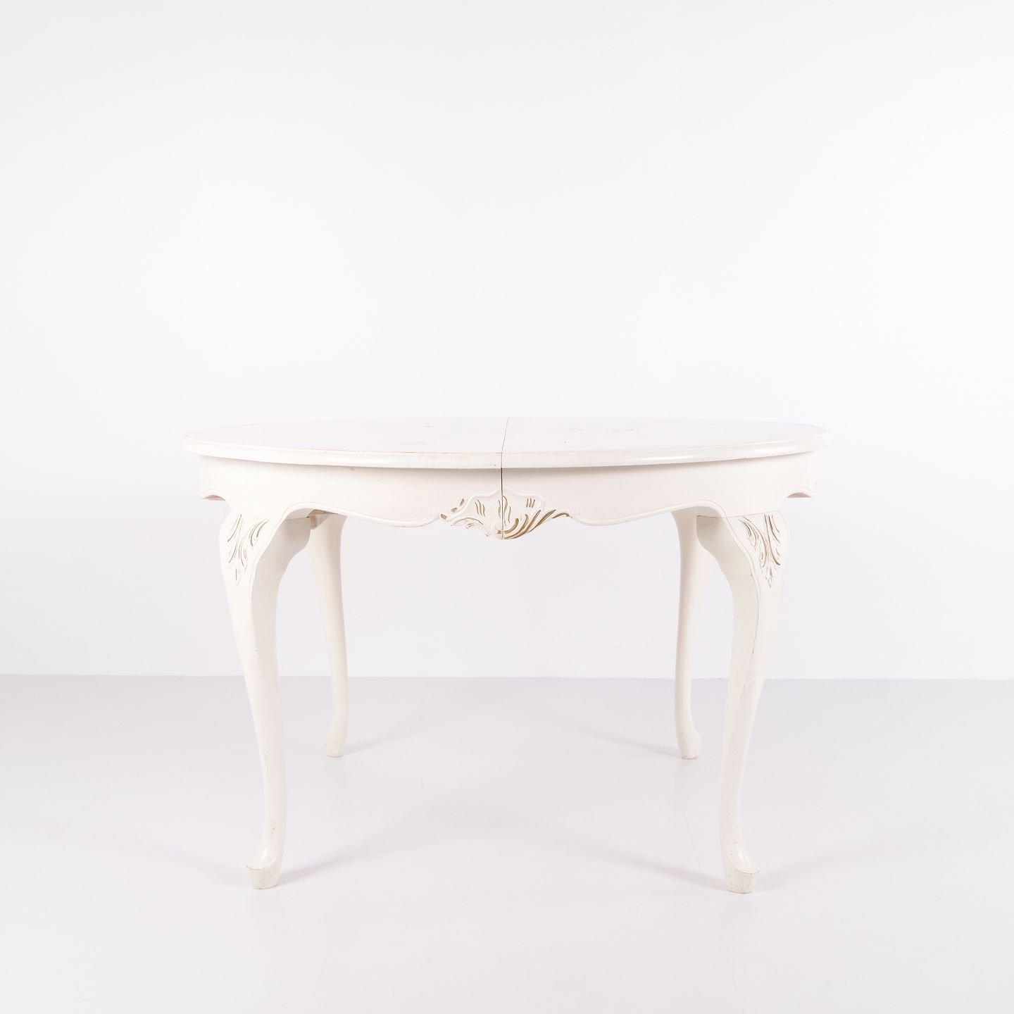 Antik rundt spisebord i ny rokoko stil fra 1920’erne. Hvidmalet med dekorative detaljer og 4 tillægsplader.