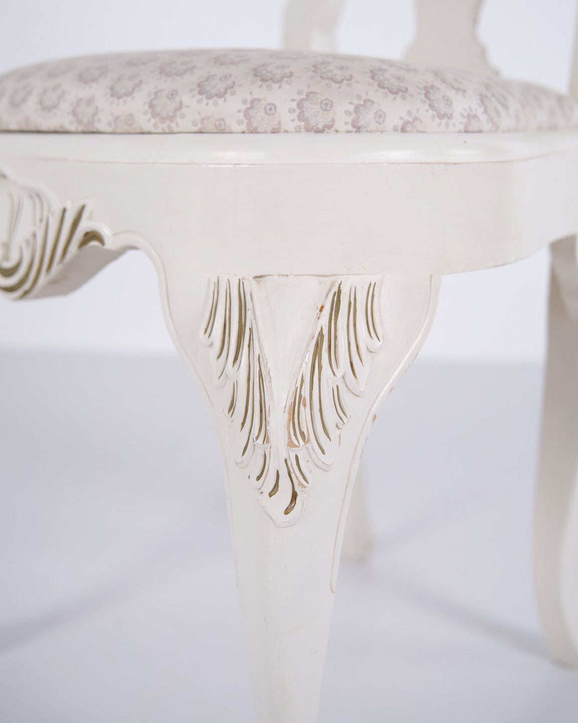 Antikke spisebordsstole i ny rokoko stil fra 1920’erne. Sæt af 6 hvidmalede stole med dekorative detaljer.