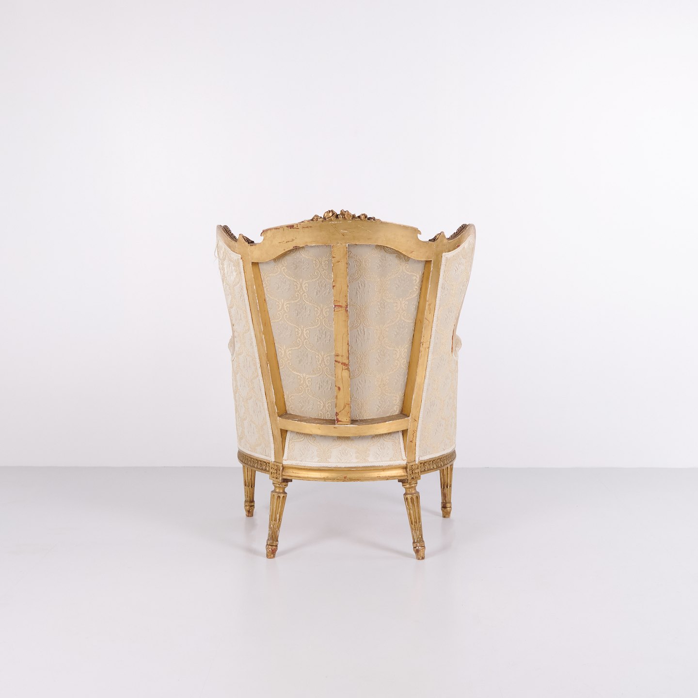 Antik bergère lænestol 1860’erne i Louis XVI stil. Forgyldt træ og lyst polster.