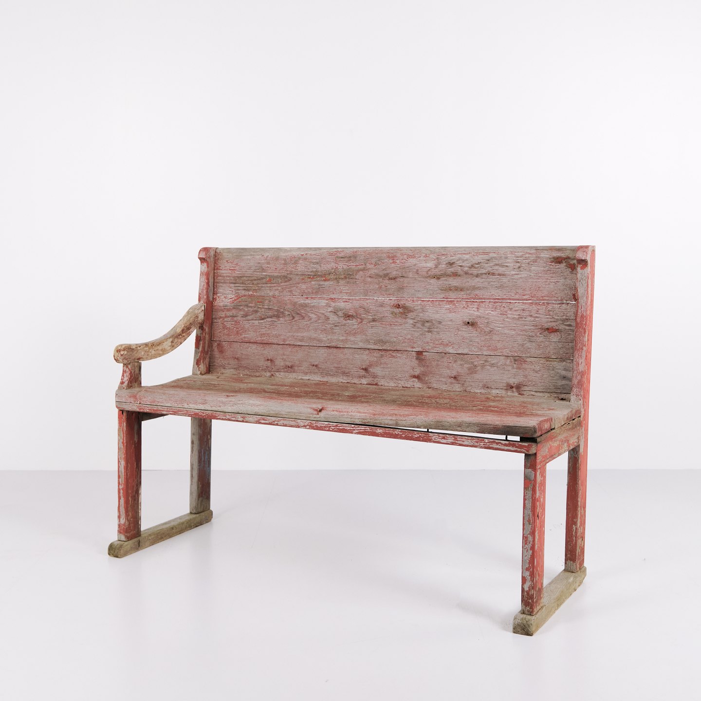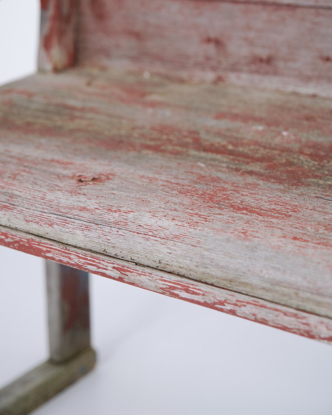 Antik bænk fra 1860’erne i original rødmalet fyrretræ. Antik rødmalet bænk 1800-tallet.