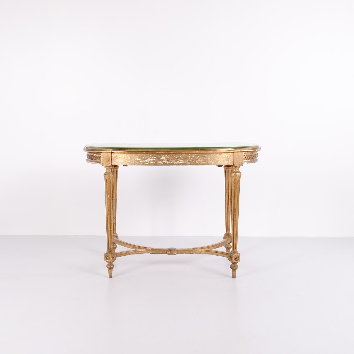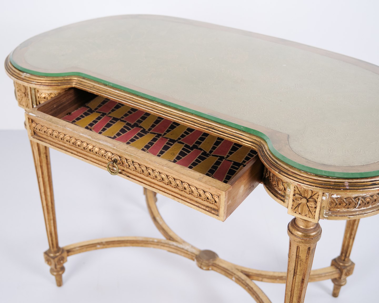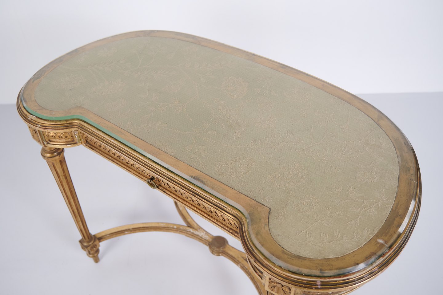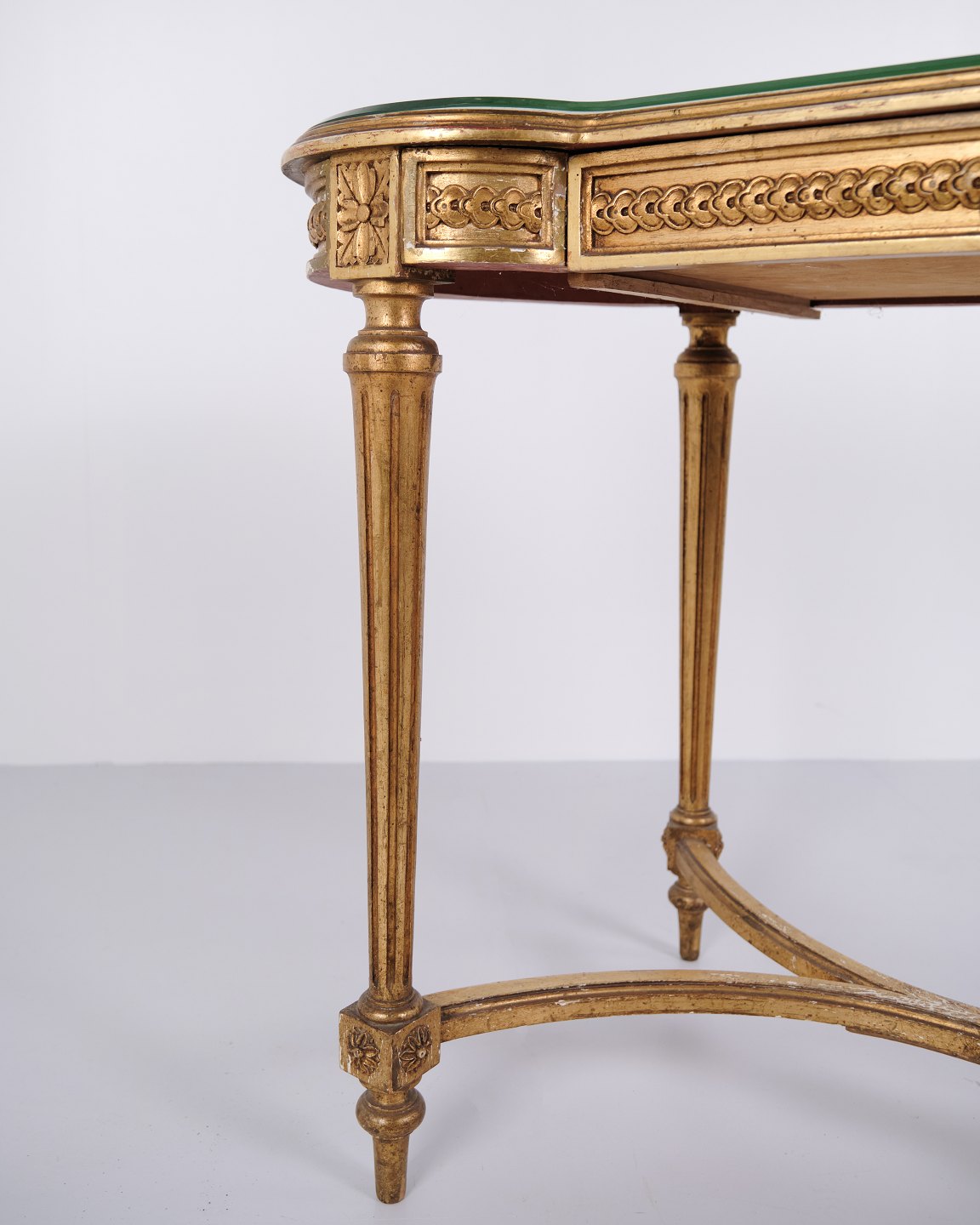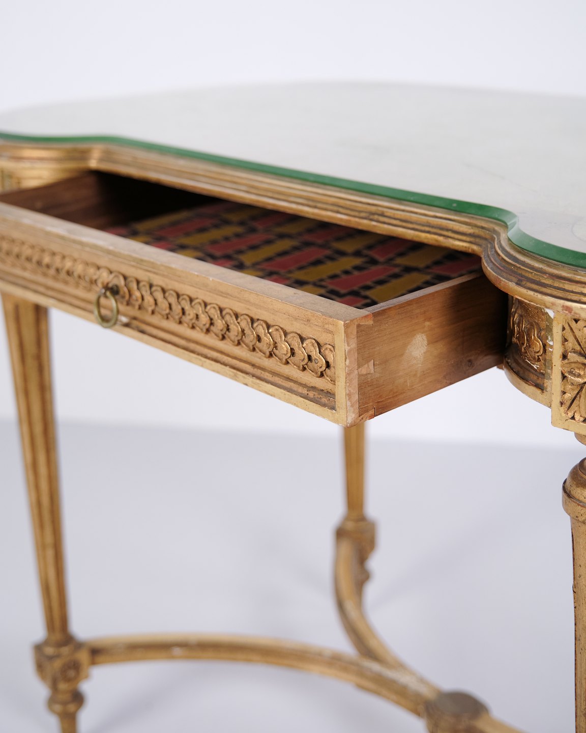Antik skrivebord 1850’erne i gustaviansk/Louis XVI stil, forgyldt træ, glasbordplade og skuffe.