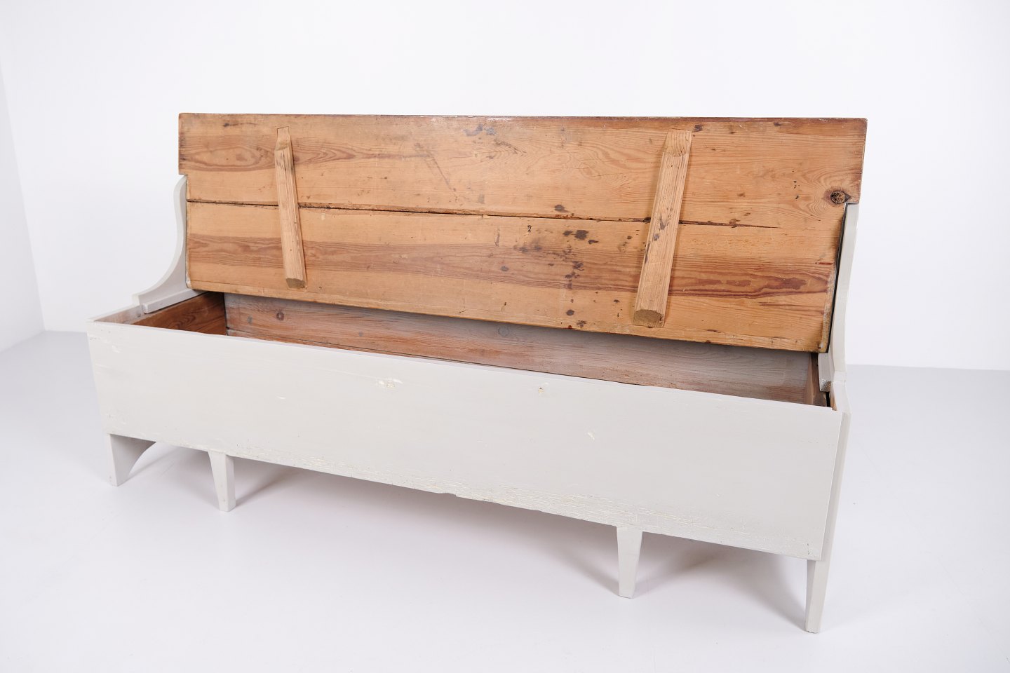 Antik slagbænk 1890’erne i gråmalet fyrretræ med opbevaring. Antik opbevaringsbænk 1800-tallet.