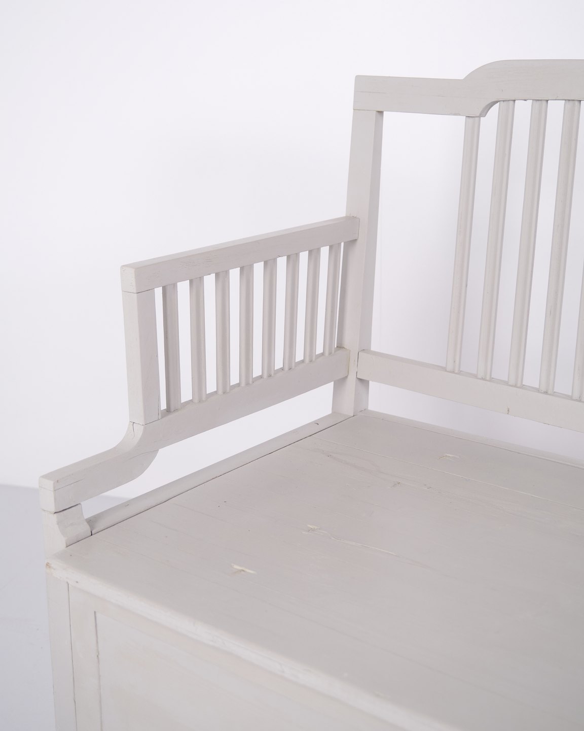 Antik slagbænk 1860’erne i gråmalet fyrretræ med høj ryg og opbevaring. Antik opbevaringsbænk 1800-tallet.