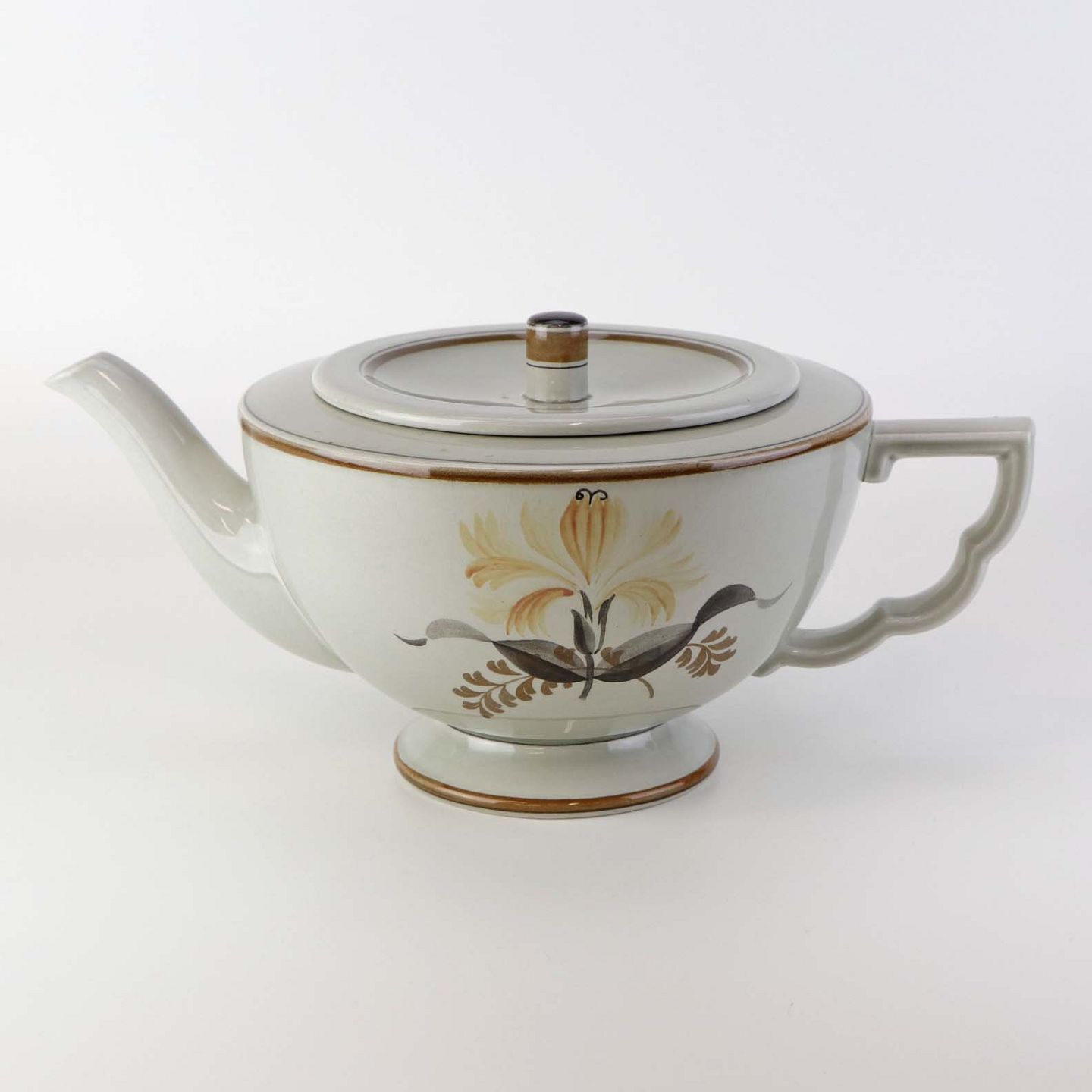 Fajancestellet er i stelformen Viktoria II med dekoration af orangebrune blomster på gråtonet baggrund med brun kant.