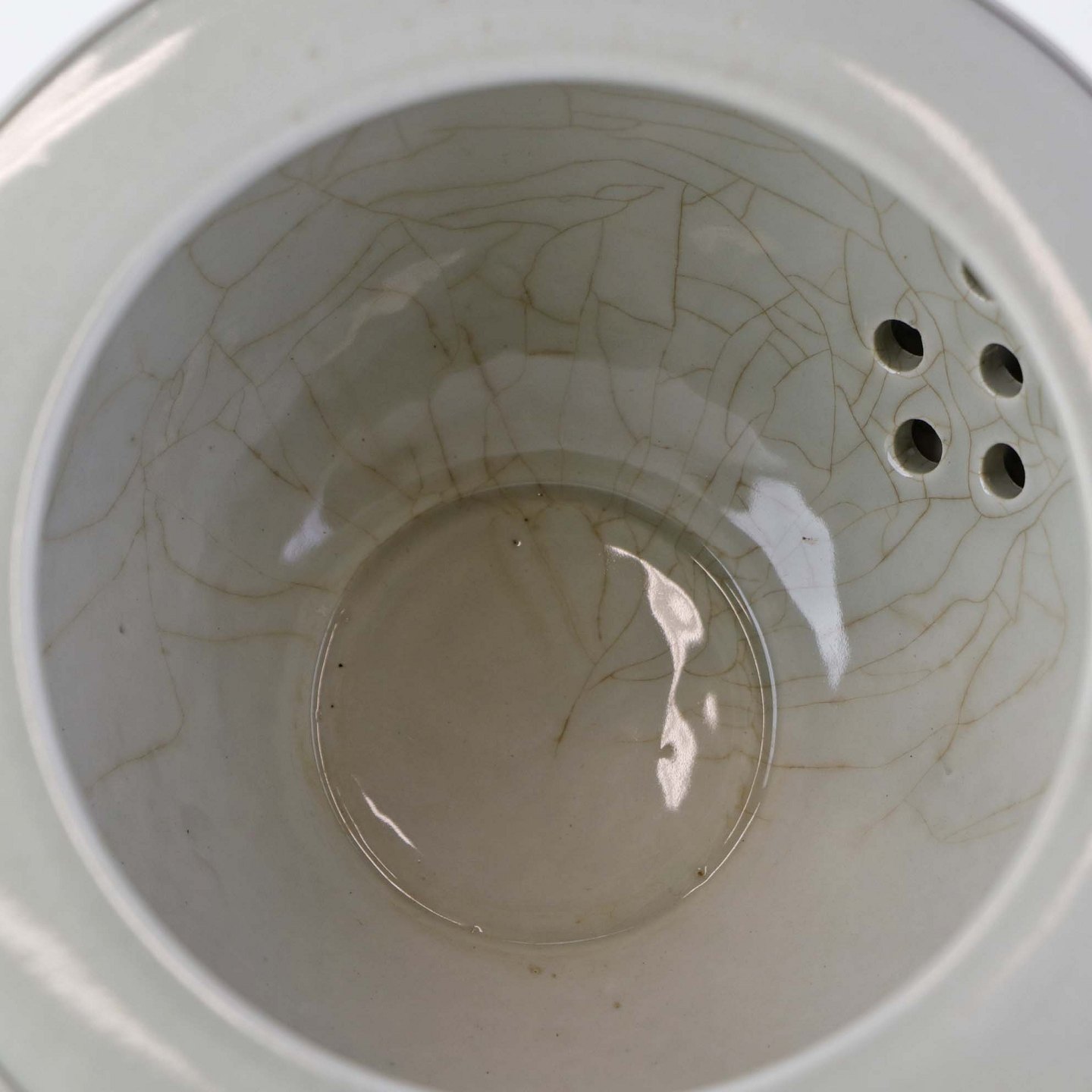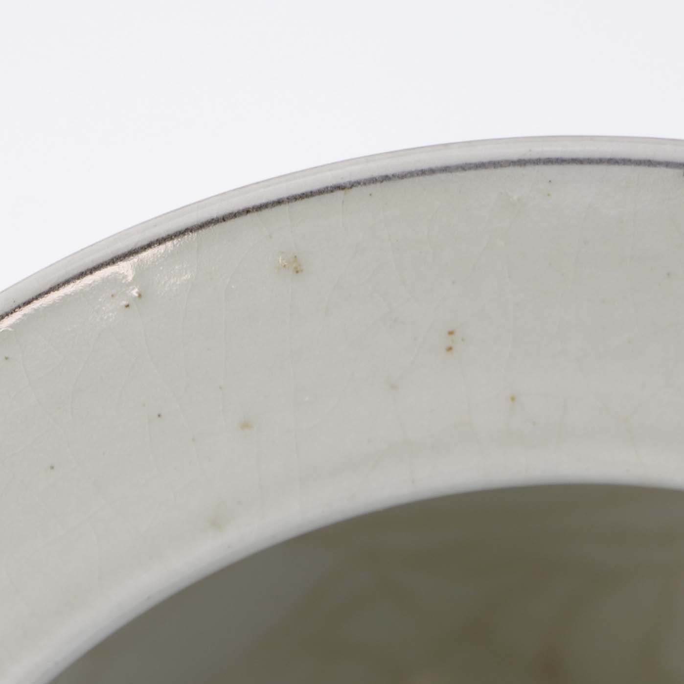 Fremstår med indvendige krakkeleringer i glasuren, lettere ujævn glasur på topkanten samt mindre brugsspor på glasuren ved tuden.
