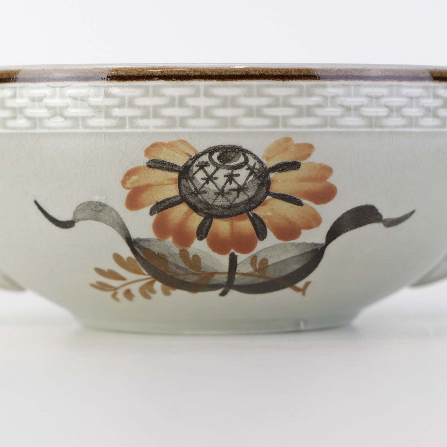 Fajancestellet er i stelformen Viktoria II med dekoration af orangebrune blomster på gråtonet baggrund med brun kant.