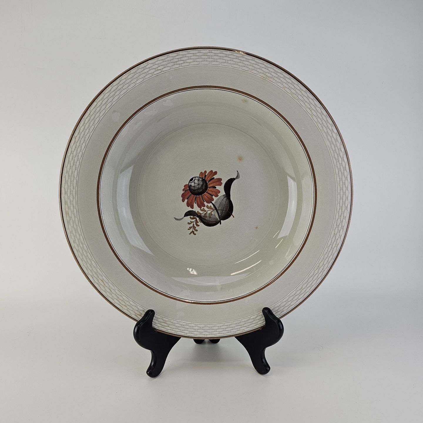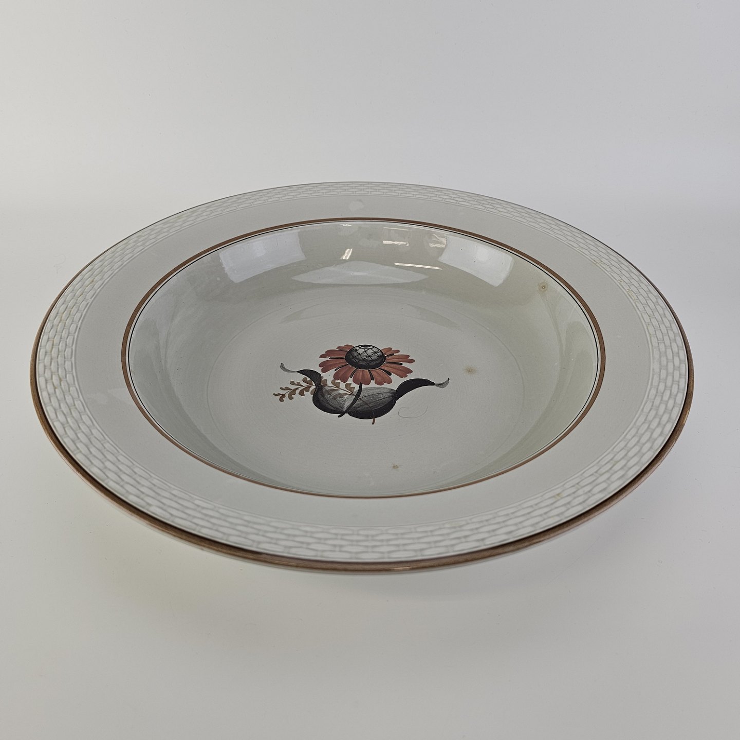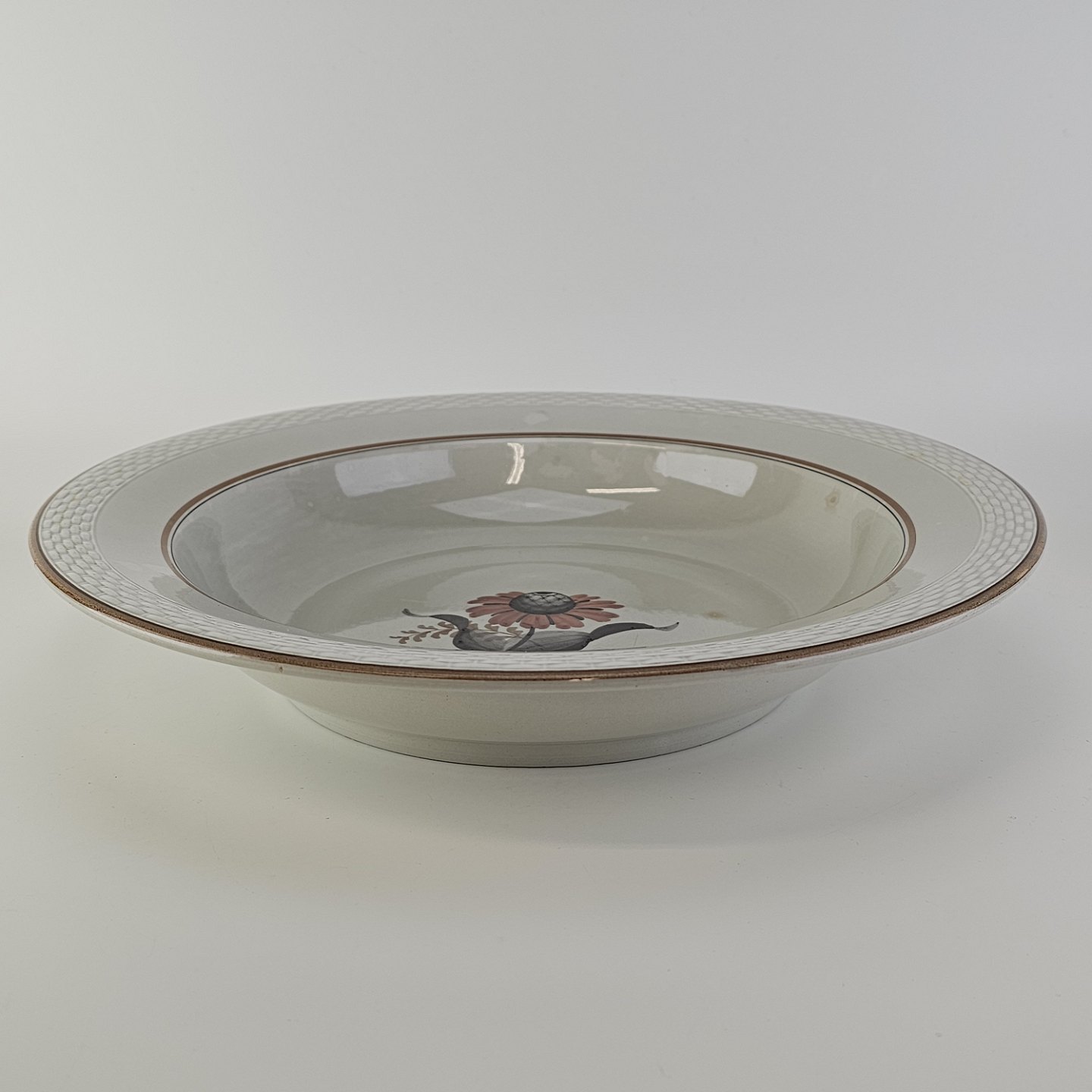 Kirsten er stel i grå fajance med brun kant og blomstermotiv