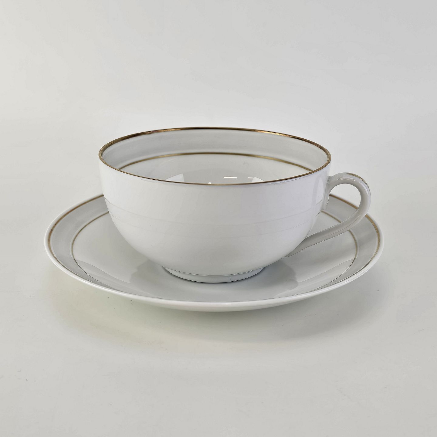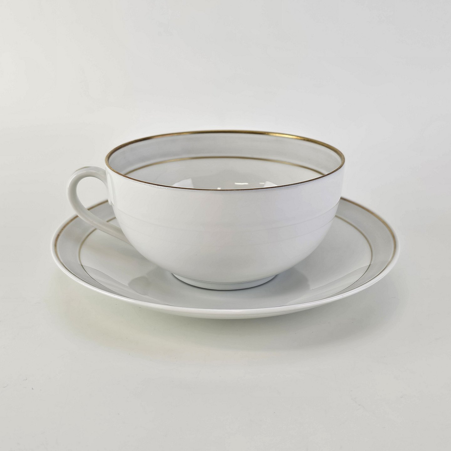 Tiber er stel i glat hvidt porcelæn med grå bort og guldkant