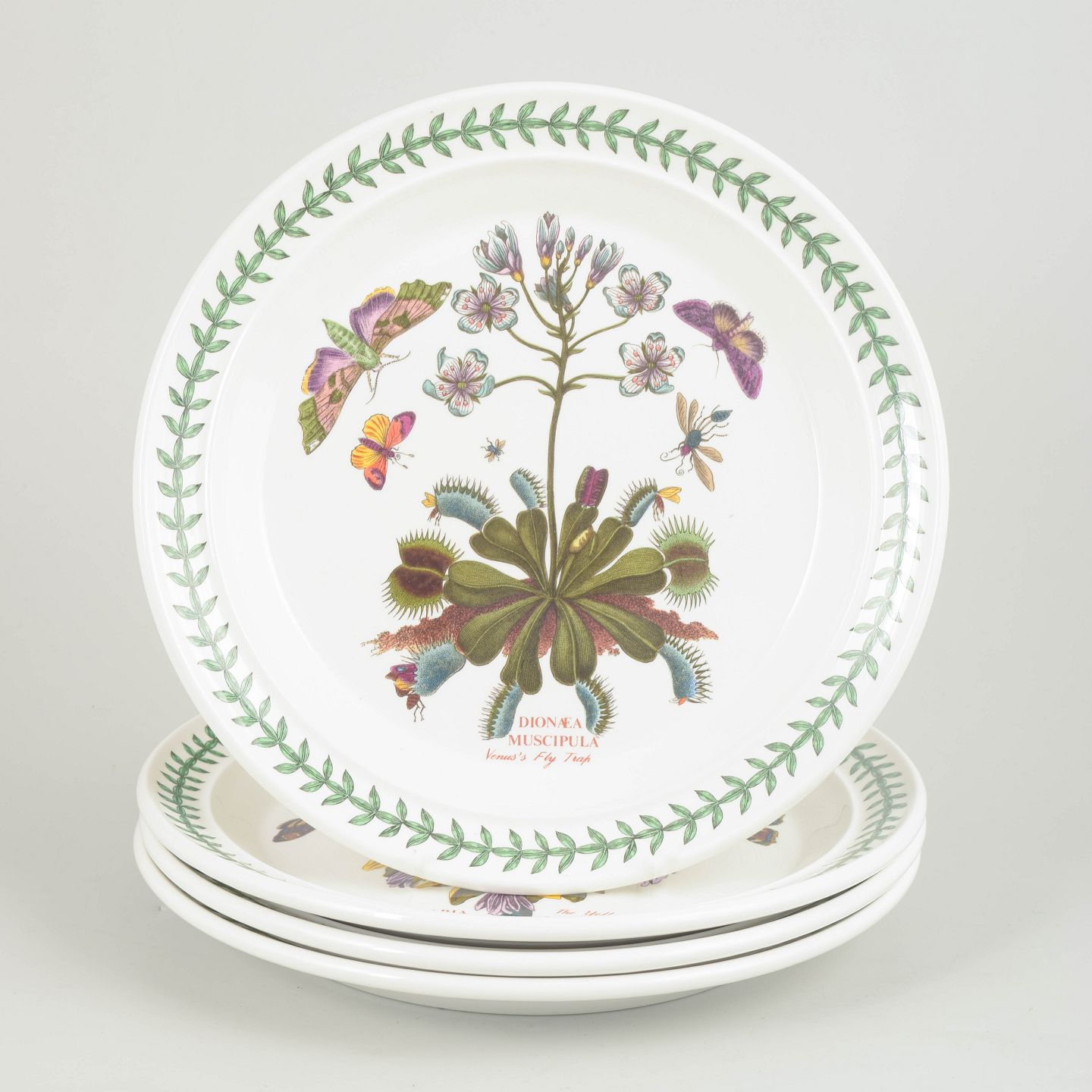 Sæt med 4 store middagstallerkener i fajance fra Portmeirion, dekoreret i “The Botanic Garden” serien med botanisk motiv og karakteristisk grøn bladbort.