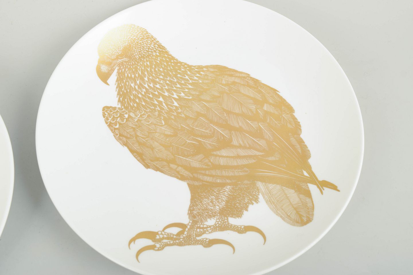 Sæt bestående af to samlertallerkener i porcelæn med fuglemotiver udført i gulddekoration. Tallerkenerne indgår i serien “Arter i fara”; den konkrete model fremgår af bagsidens tryk med titel, serienummer og artsbeskrivelse. Produceret i begrænset oplag i 1980’erne.