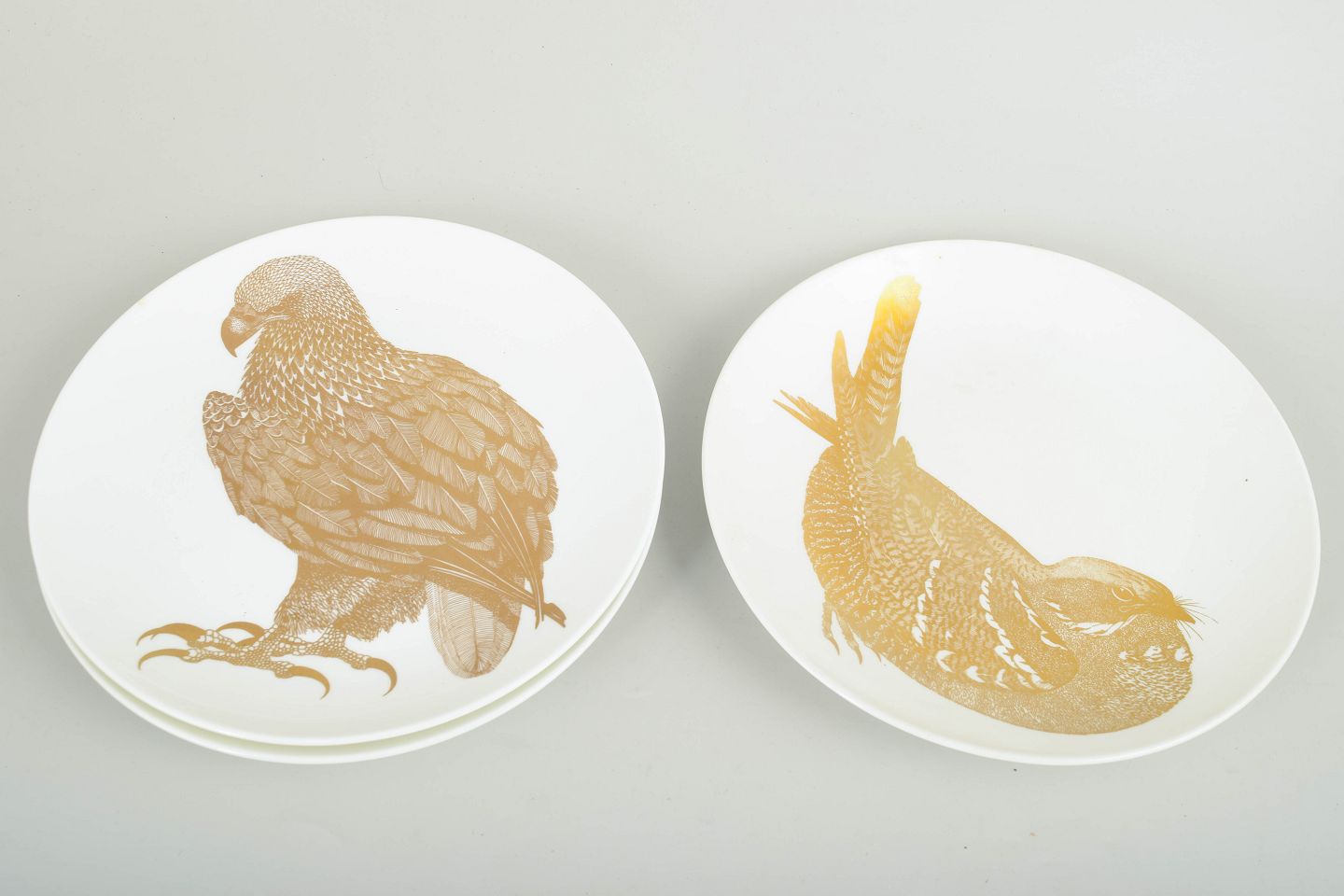 Sæt bestående af tre samlertallerkener i porcelæn med fuglemotiver udført i gulddekoration. Tallerkenerne er en del af serien “Arter i fara”; modelbetegnelserne fremgår af bagsidens tryk med titel, serienummer og artsbeskrivelse. Produceret i begrænset oplag i 1980’erne.