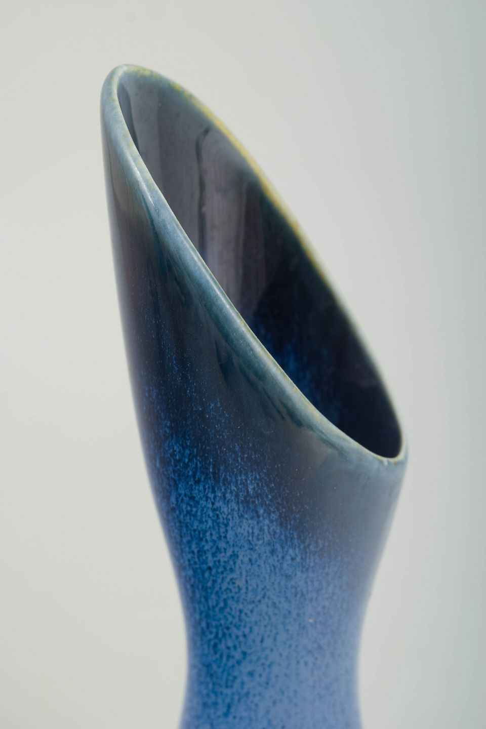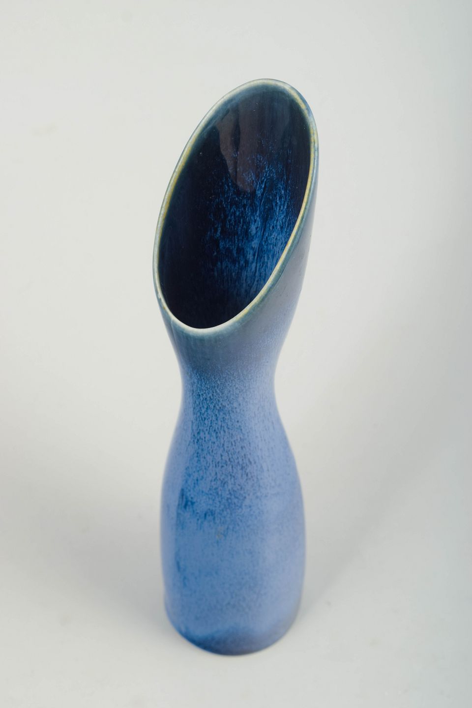 Skulpturel, slankt formet vase i glaseret stentøj med organisk, let asymmetrisk munding. Vasen er udført i en dyb blå glasur med levende overfladestruktur og fremstår som et markant eksempel på Stig Lindbergs frie og eksperimenterende formsprog. Original Gustavsberg-mærkat bevaret.