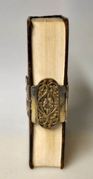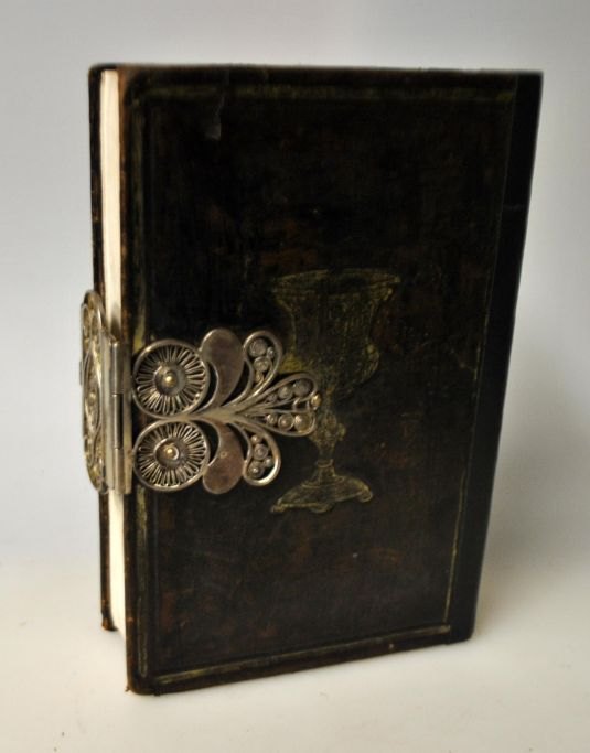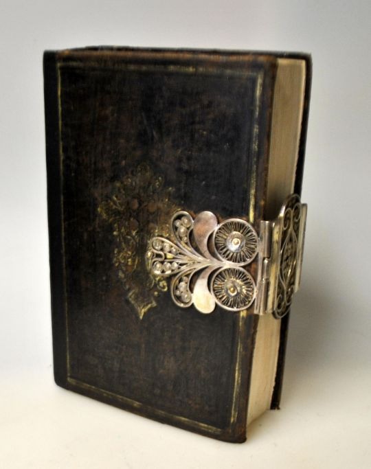 Salme bog i sort læderindbinding og sølv beslag, 1857. Danmark. Sølvbeslag med filigram. H.: 17 cm. Sølvbeslag med utydeligt mestermærke.