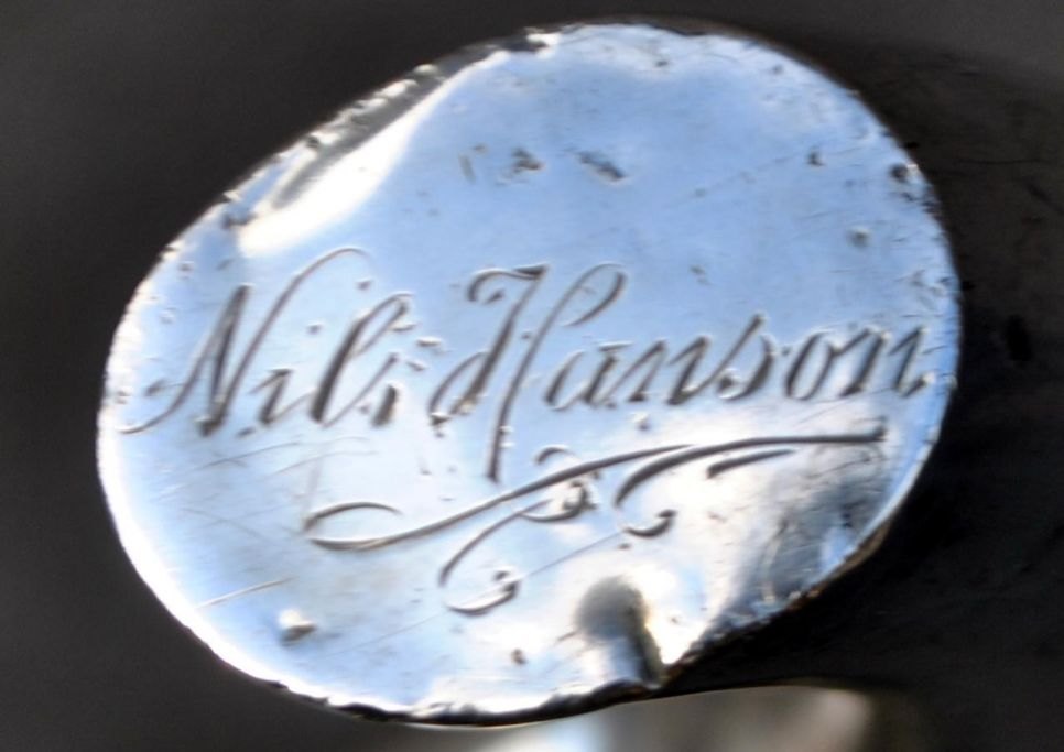 Stok i træ med sølvhåndtag, 1905, Sverige. Stemplet: EL. Indgraveret: Nils Hanson og 8/6 1905. L: 89 cm.