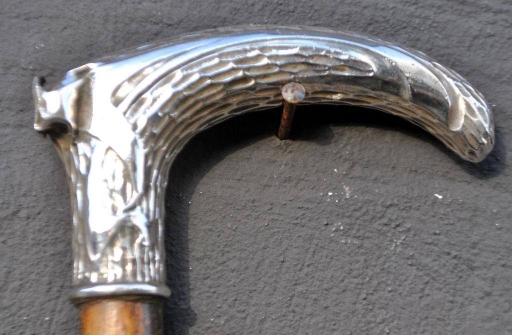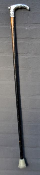 Stok i træ med sølvhåndtag, 19. årh. Håndtag dekoreret med riller. Utydelige stempler. Indgraveret: P. Med gummifod. L: 82 cm.