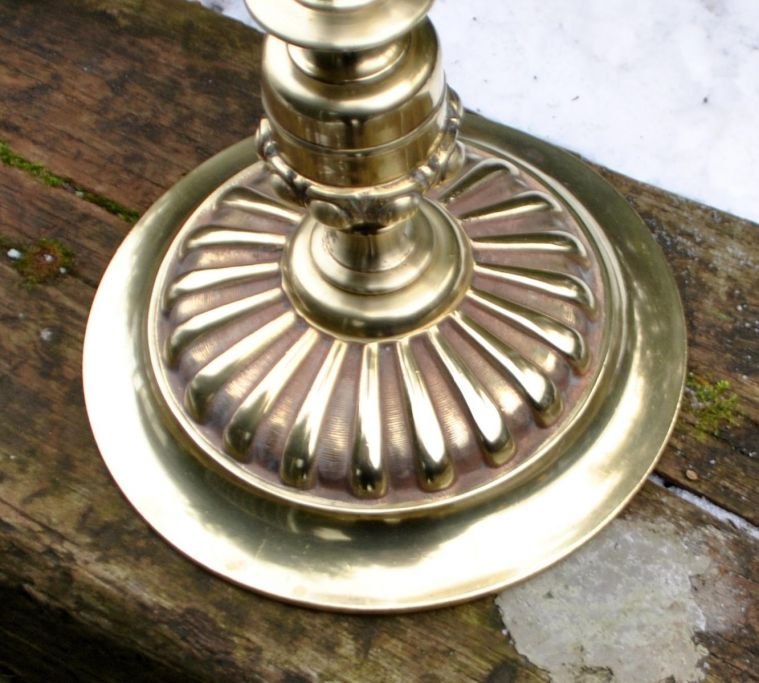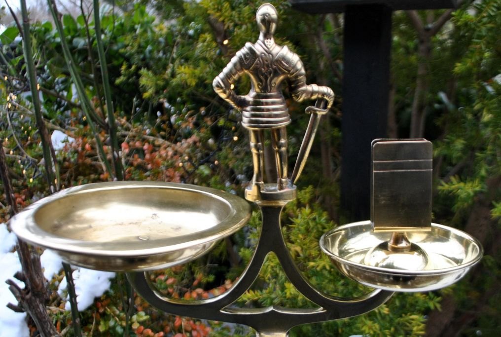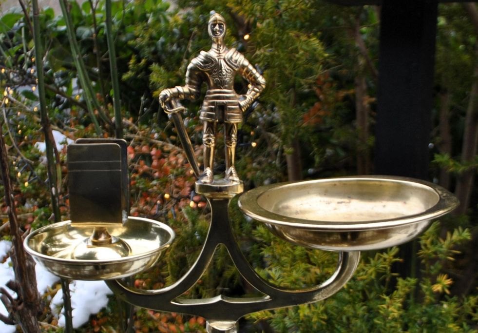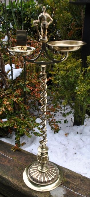 Messing stander med askebæger og tændstiksholder, 19. årh. Med dobbelt-snoet søjle og på toppen dekoreret med en ridder i rustning. På rund fod. H: 86 cm. B: 32 cm.