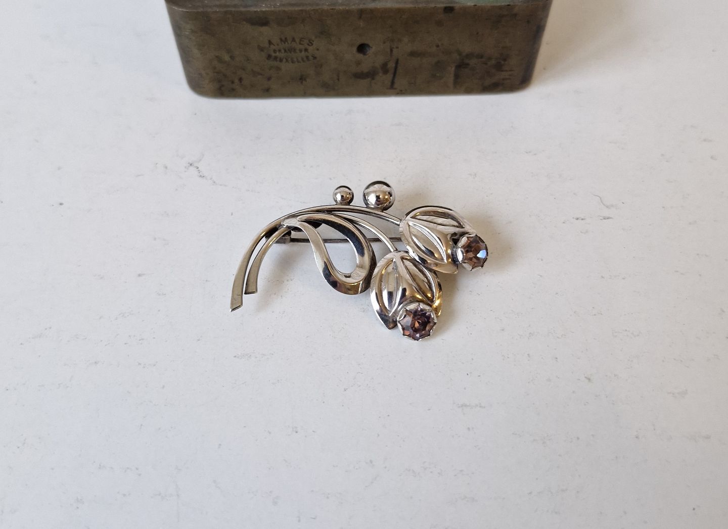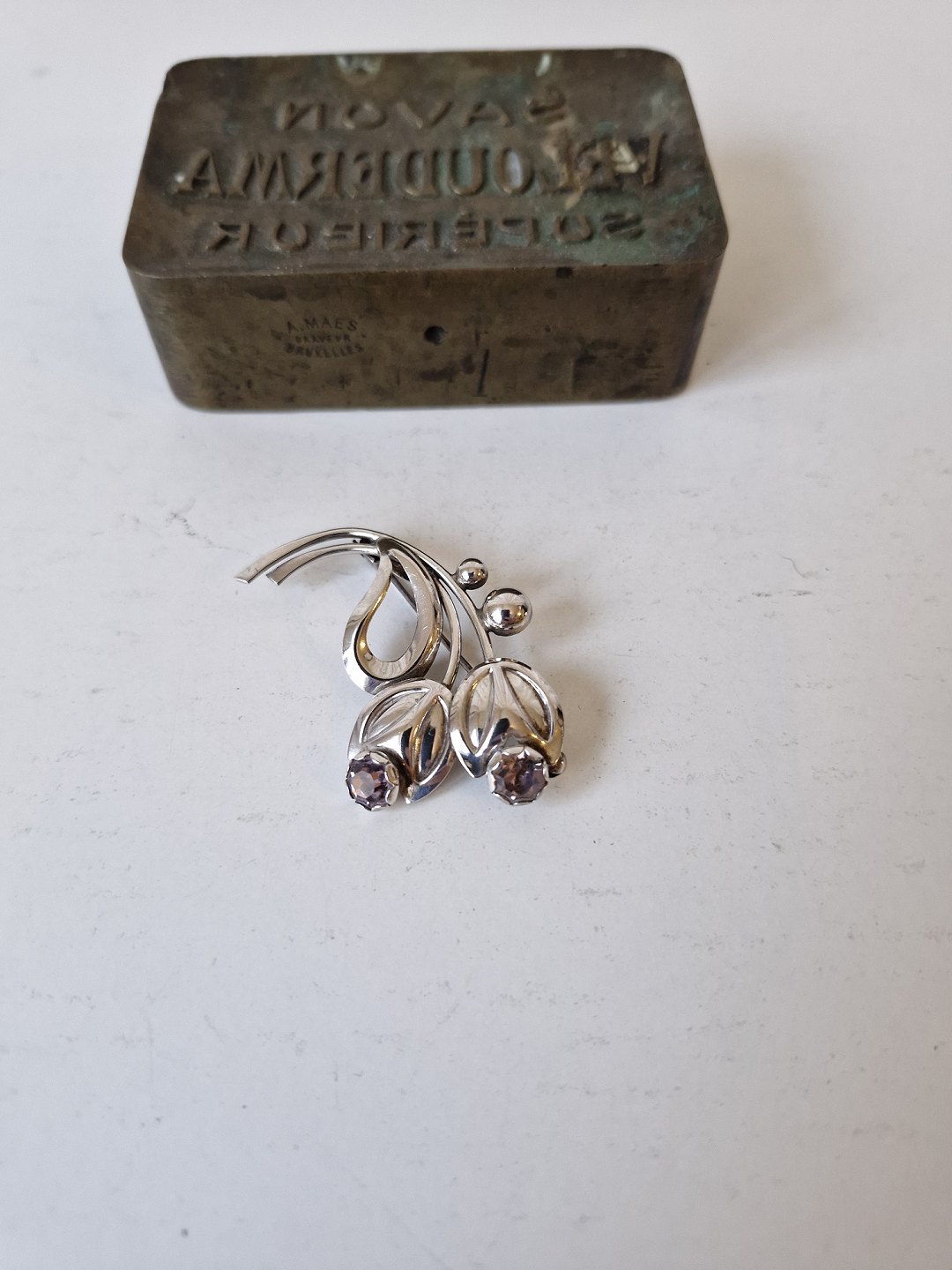 Vintage silver brooch in the shape of leaves and flowers with purple stones by Hermann Siersbøl