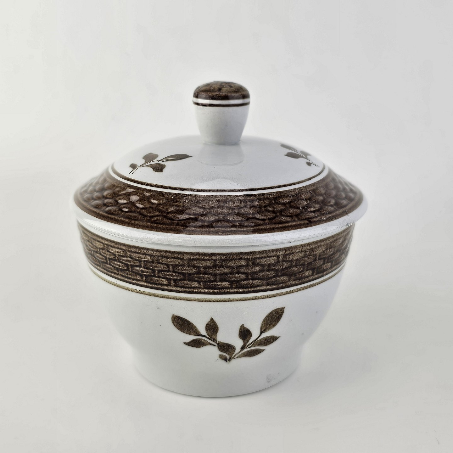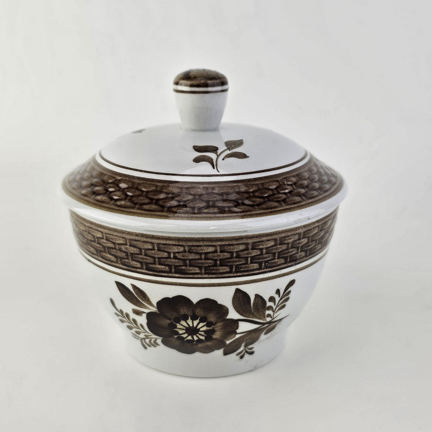 Sukkerskål med låg i fajance fra stellet Brun Tranquebar fra år 1919