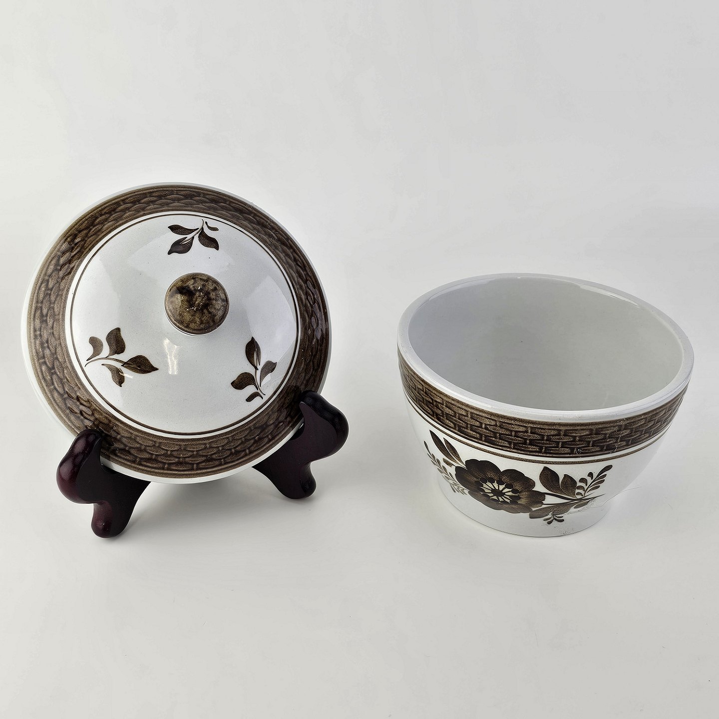 Fajancestellet med flettet kant og dekoration af brune blomster på lys baggrund med brun kant